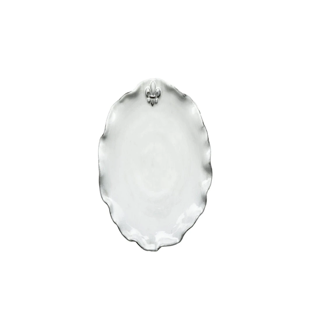 A handmade ruffled edge plate with Fleur de Lis symbol and white washed glaze finish. Practical yet charming. Made in Italy, the entire Fleur De Lis Collection is a best seller. Sold as Set of 4.