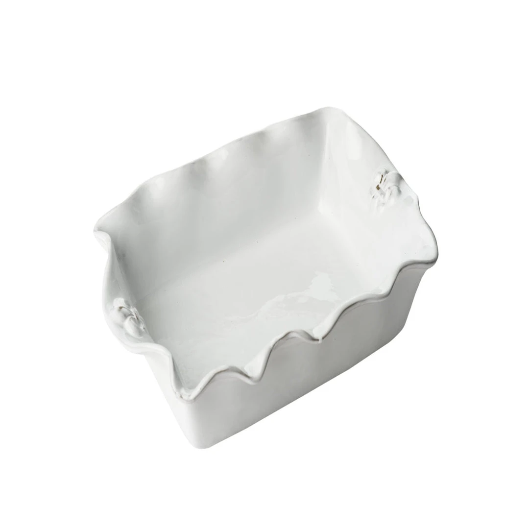 This generous casserole is a real treat to own and to serve in. It is one of the most attractive items in the Fleur de Lis Collection. A nice ruffle edge is decorative and the raised Fleur de Lis symbol adds a design element. Made in Italy. Length: 9″ Width: 13″ Height: 3″