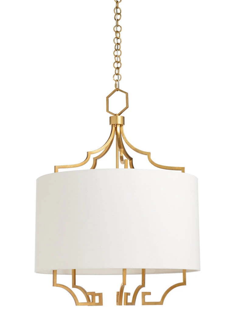 Make a beautiful statement with the Chiara Chandelier. The off white linen on vinyl with Antique Gold Leaf Iron Frame will bring dazzling details to your living space.