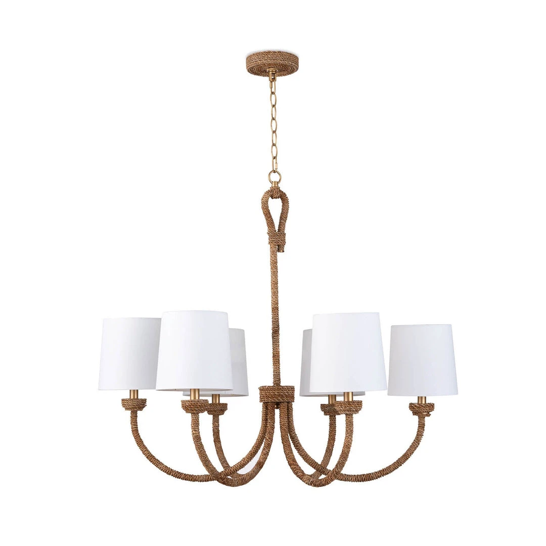 Natural woven rattan provides a “washed ashore” look on the Bimini chandelier. Looped detailing also provides a nautical touch, while six crisp natural linen shades tailor the look. Install above a dining room table in a coastal or rustic kitchen to tie its design together.