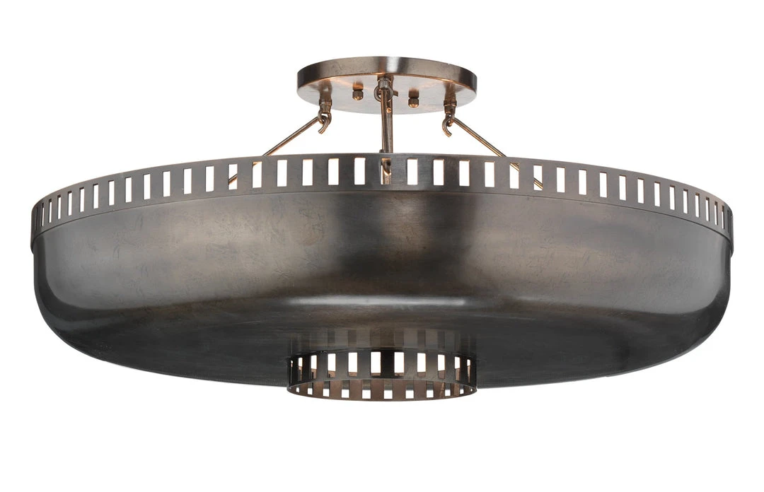Perforated antique bronze metal wraps around the Constantine Semi Flush Mount. The richness in finish is the perfect accent to any low ceiling. A great chandelier substitute for any small space with height restrictions while still being big on style.