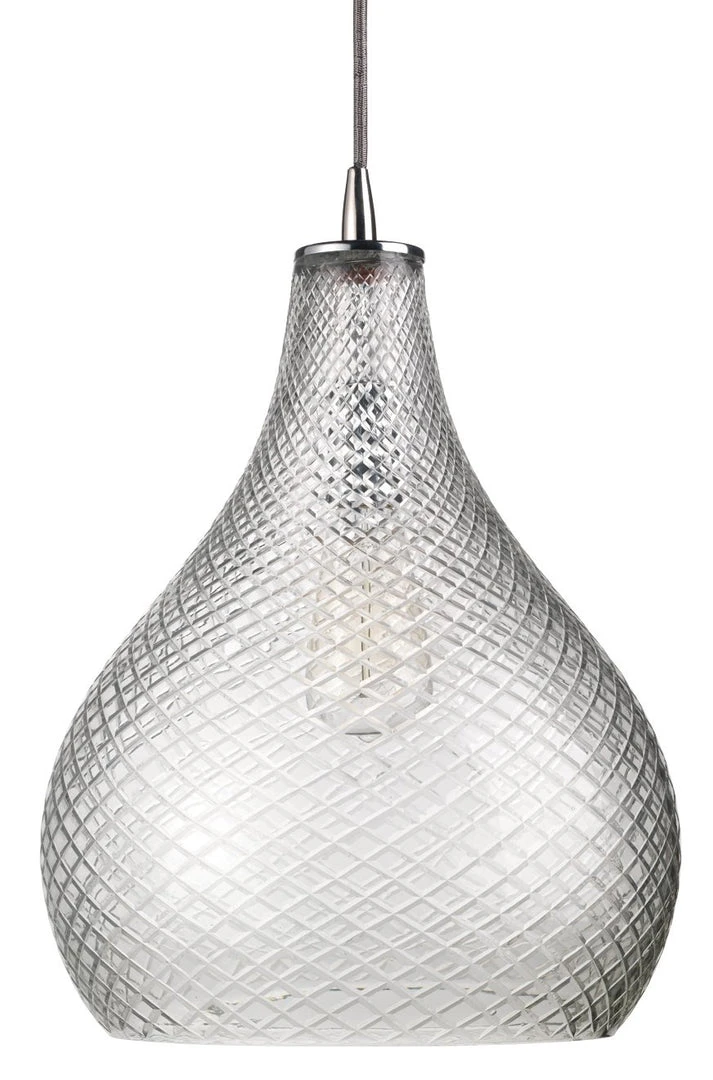 Textured and eye-catching, this contemporary pendant light works great above bar areas, kitchen islands, and dining tables for a chic, stylish look. A textured cut glass shade with a curved design and gray tint hangs from eight feet of cord, adding ambient illumination to your home.