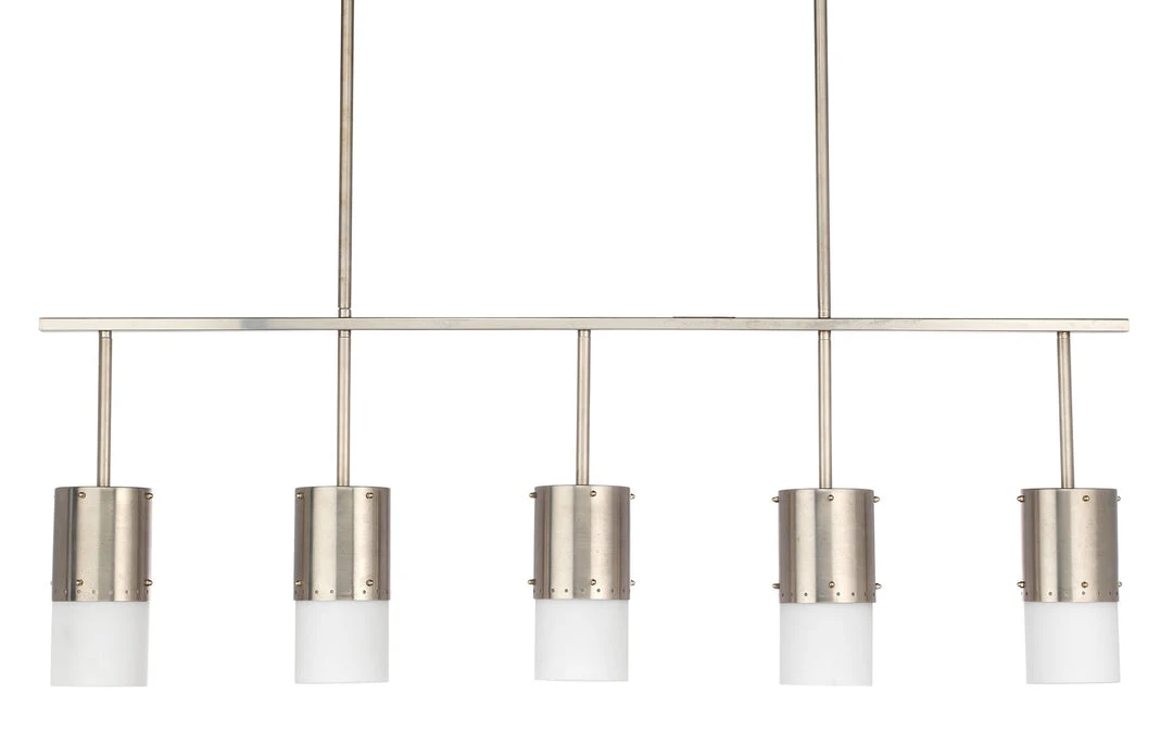 The Lazio chandelier’s perfect patina on antique silver metal brings a little warmth to the crisp white glass shades. At 50″ wide, this industrial glam fixture adds style to length, perfect above any dining room table.