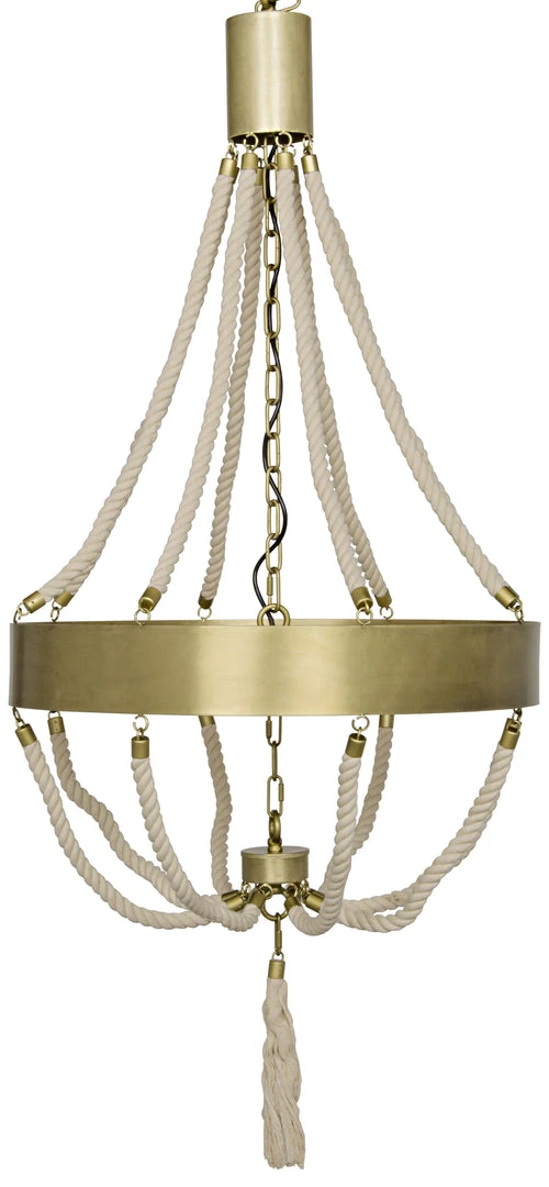 An elevated coastal accent, the Alec chandelier has been artisan crafted of antique brass metal accented with hand tied natural rope.