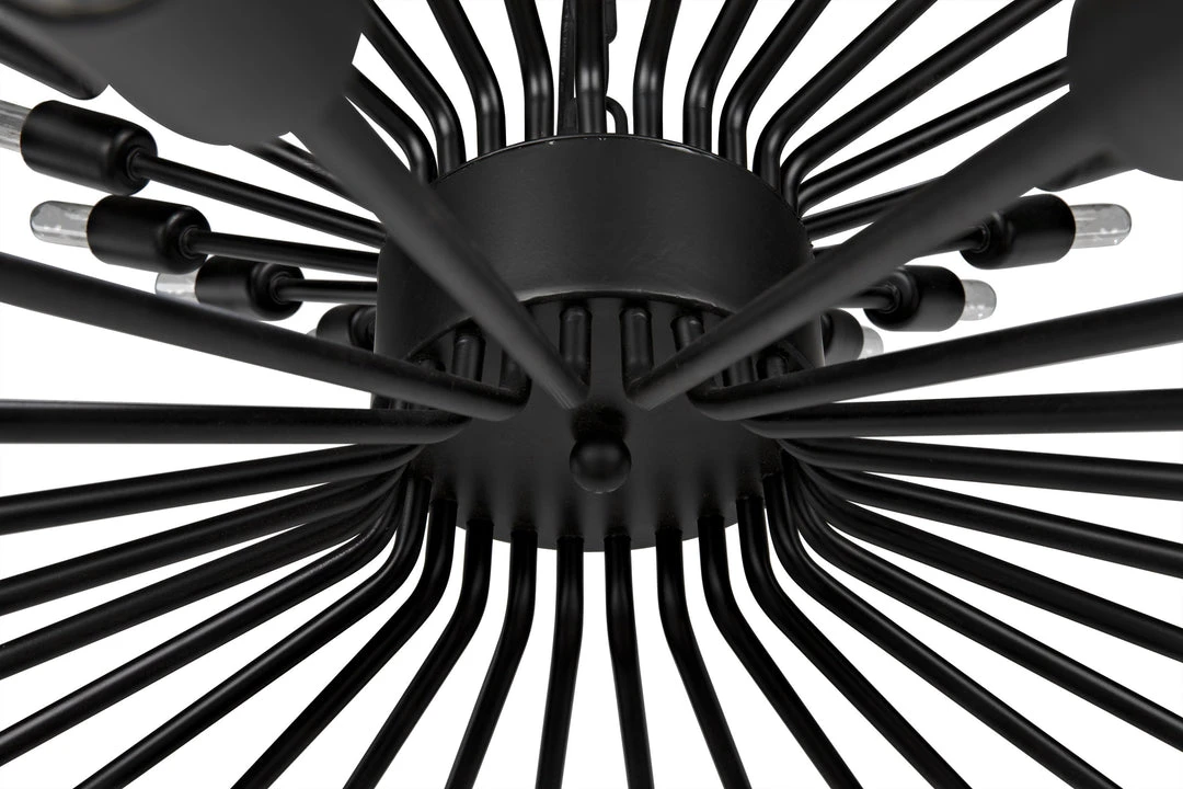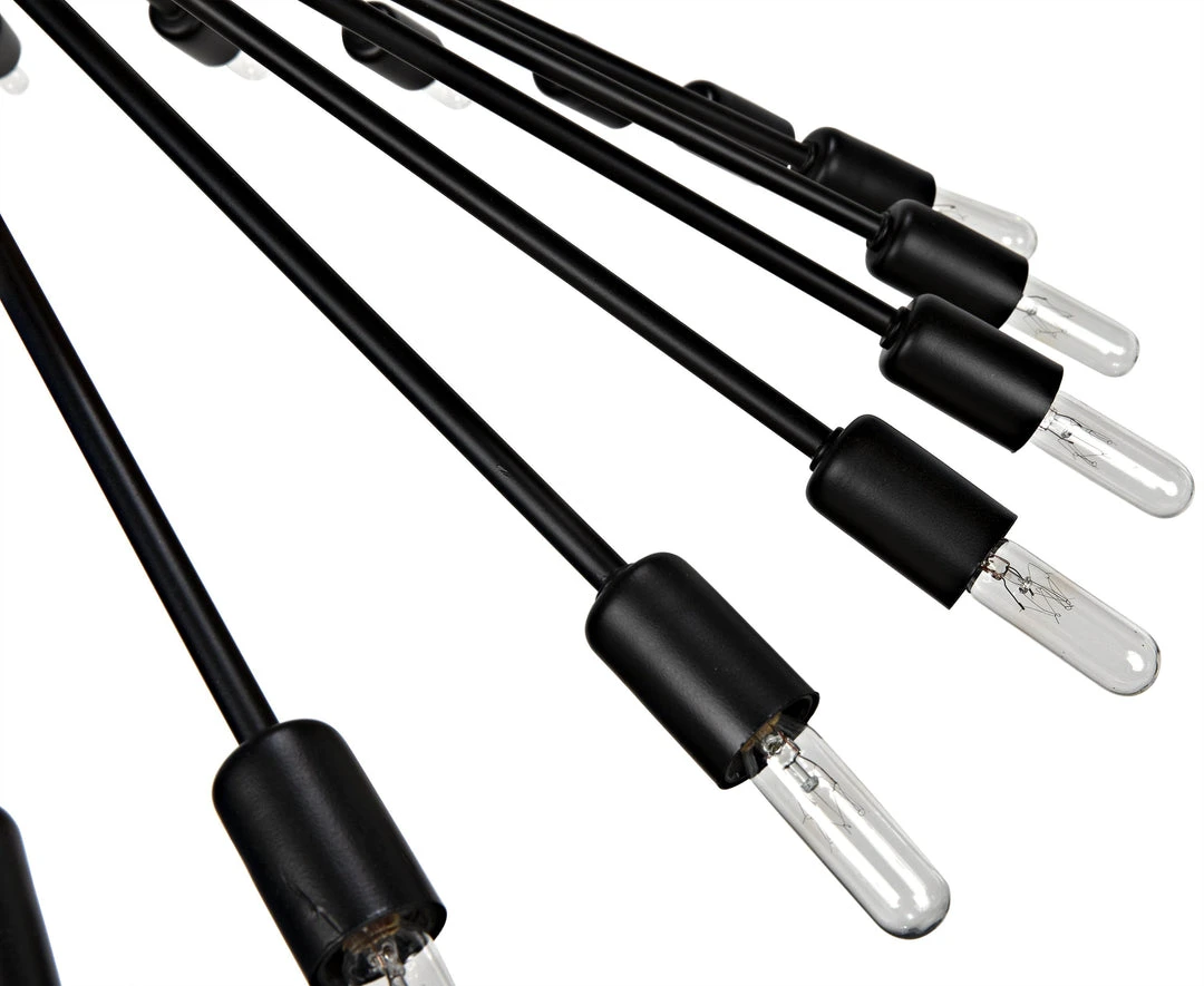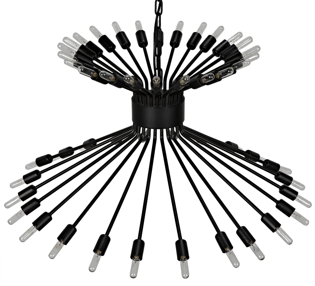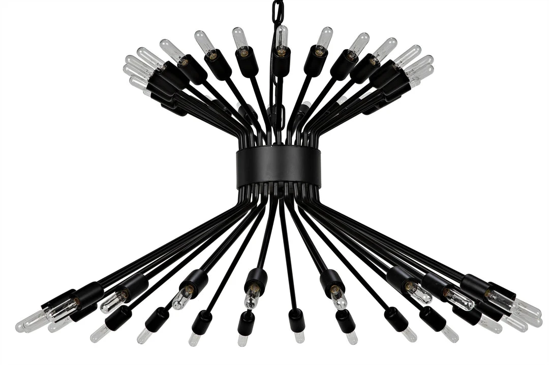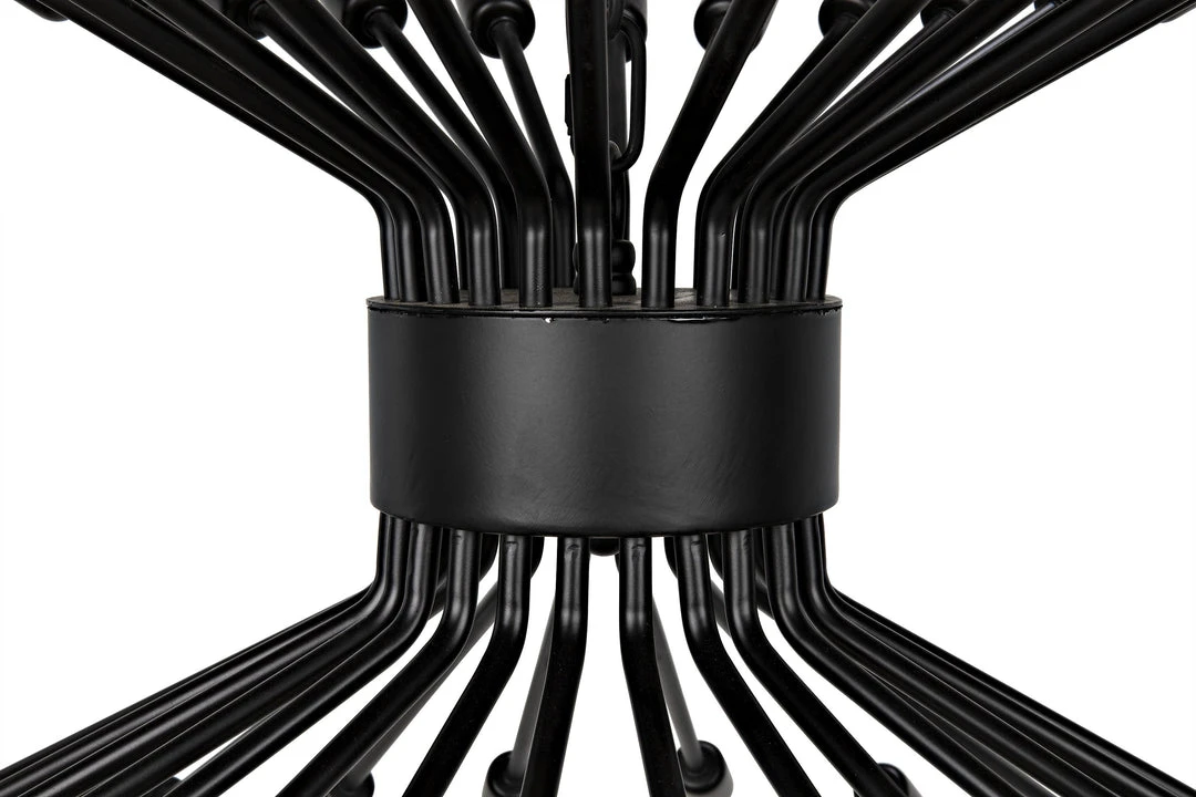 This spectacular, sculptural 48 bulb chandelier has been artisan crafted of matte black metal. Industrial, edgy, and attention demanding, it will stand out, and stun in, any modern d_cor.