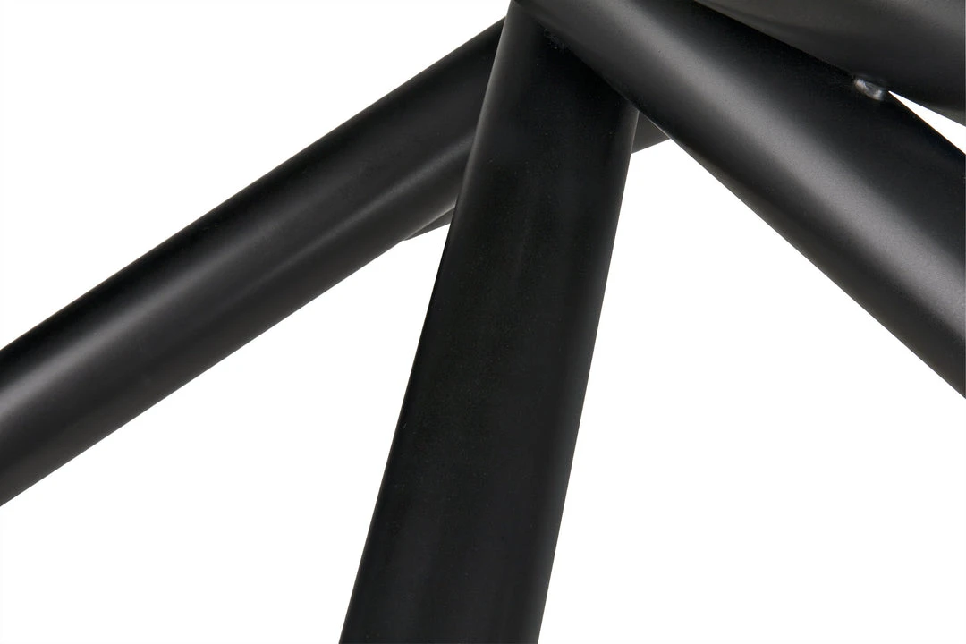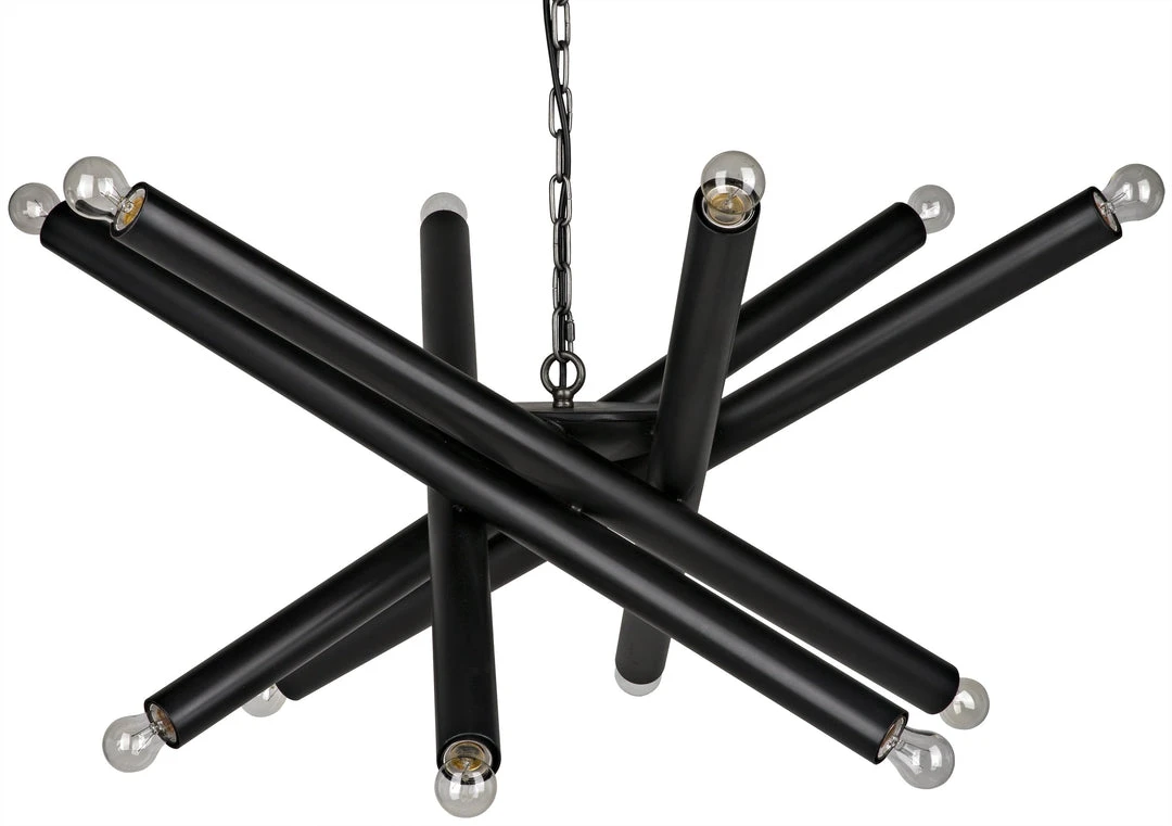 A starburst of metal tubes, each bookmarked by small bulbs, is held aloft by a metal chain in an elegant, futuristic jumble, to create the Lex chandeliers from Noir. The effect is glamourous by day, and stunning when lit.