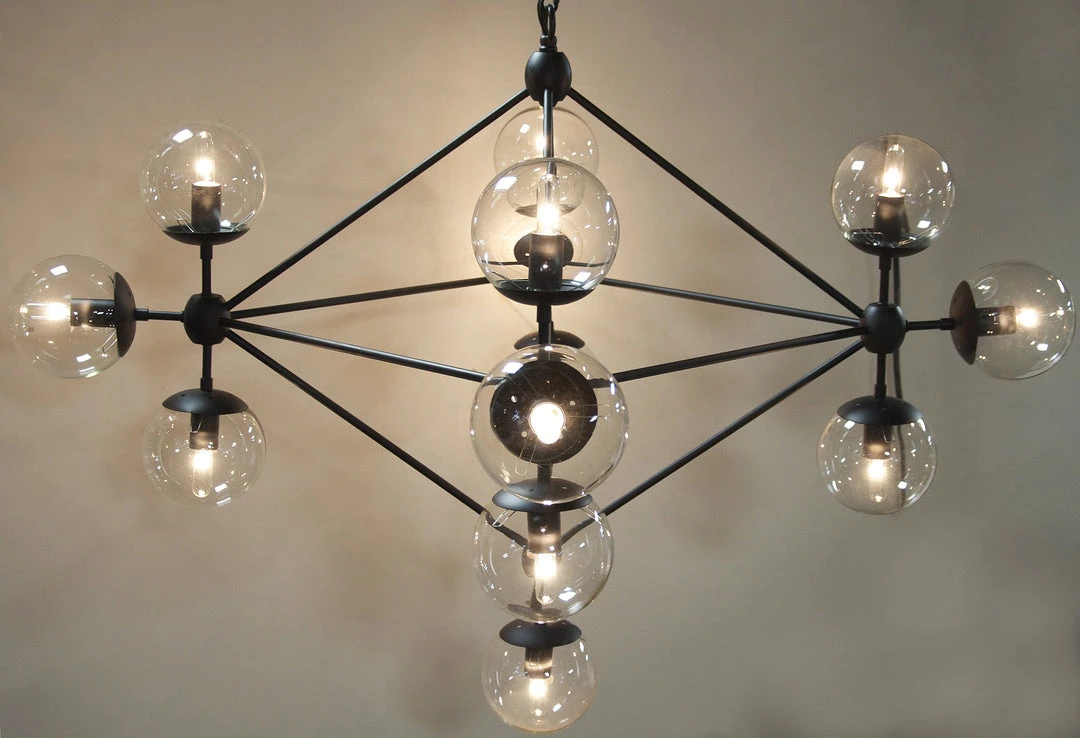 Add light, elegance, and a touch of whimsey to your world with these celestially inspired Pluto chandeliers. Thirteen round glass bulbs orbit a diamond-shaped metal internal structure, creating a lighting solution that stuns from any angle” Available in two sizes and finishes.