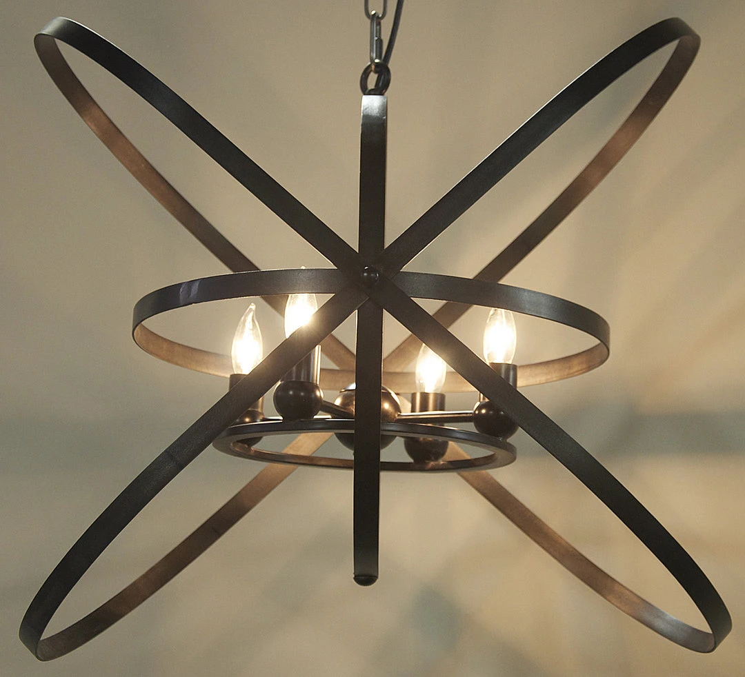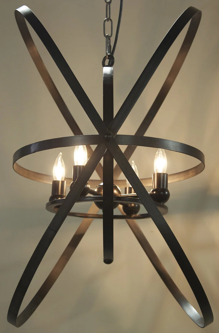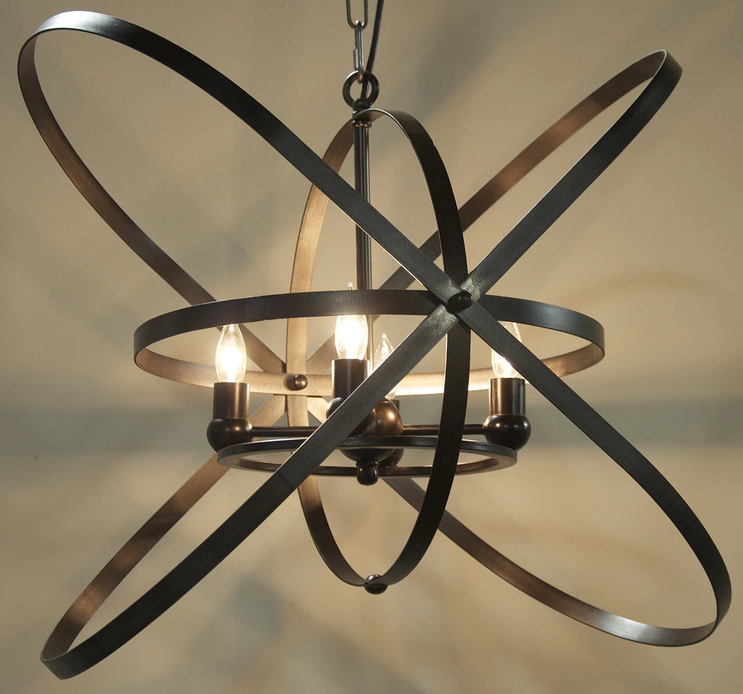 An armillary inspired pendant encircles four small bulbs to provide soft flattering lighting when lit, and a stunning sculptural accent during the day. Available in a black or antique brass pendant.