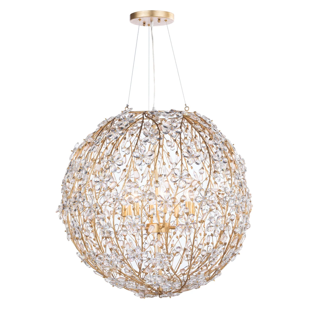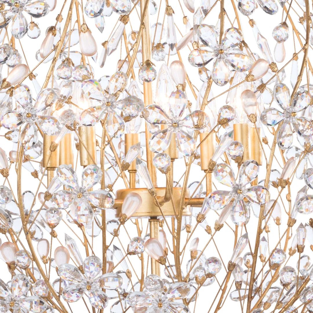 Delicately crafted crystal flowers suspended by gold frame, gives this chandelier a strikingly romantic feel. The hand-polished flowers refract light into brilliant sparks, making this fixture a truly dazzling statement piece.