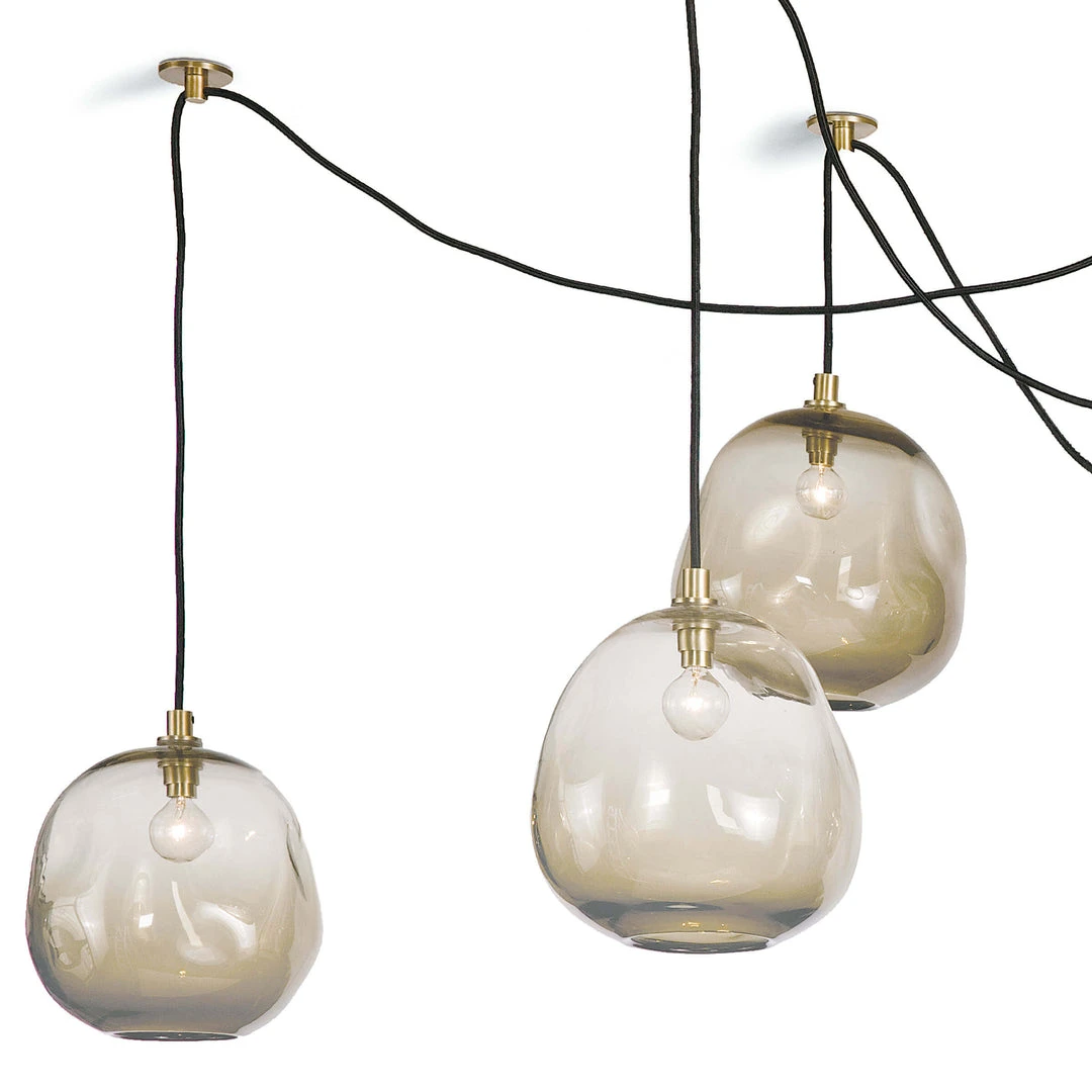 This chandelier’s hand-crafted glass shades suspended from rope cords lend a distinct, artisan effect that can create a variety of display options. Molten glass has an inherent beauty of variation in texture and size for a stunning modern appeal..