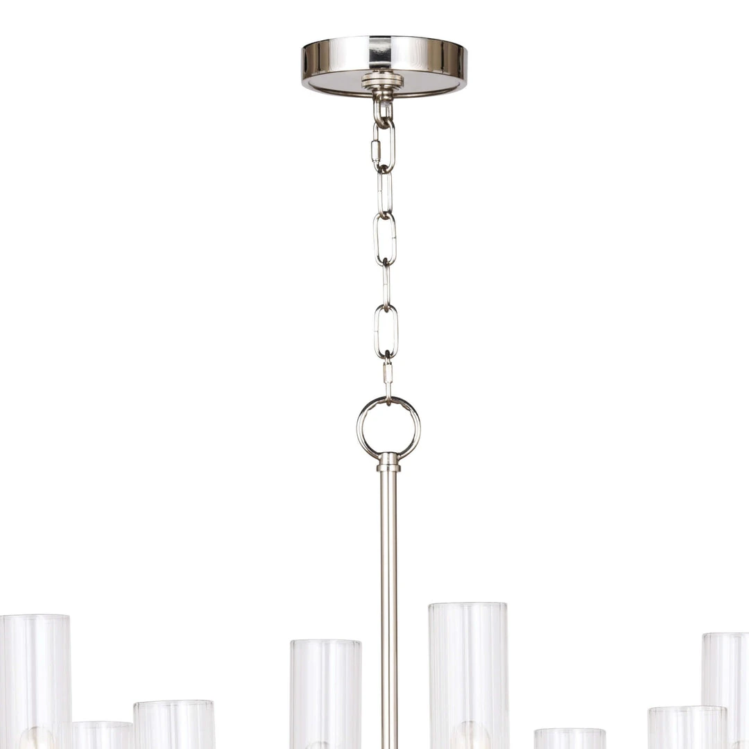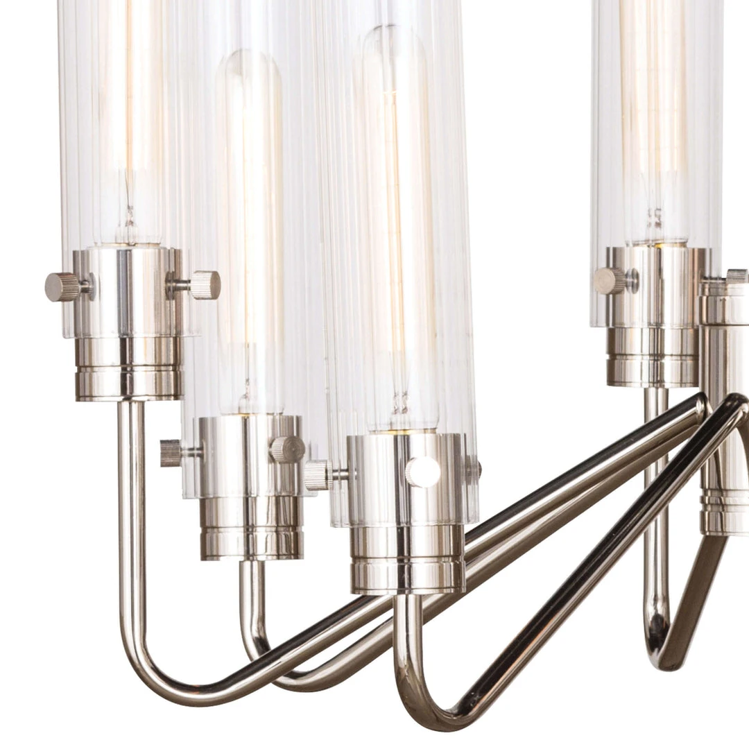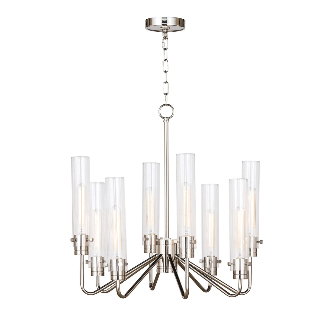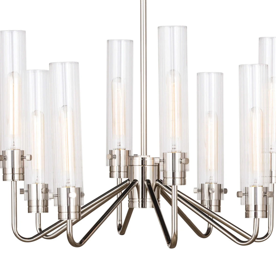 On this updated traditional chandelier, eight glass shades showcase vintage-style bulbs and a polished nickel finish adds a glamorous touch. Faux knobs bring an industrial feel. Place in a breakfast nook or above a small dining room table.