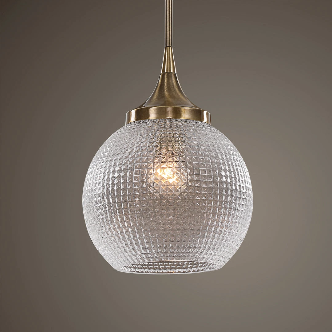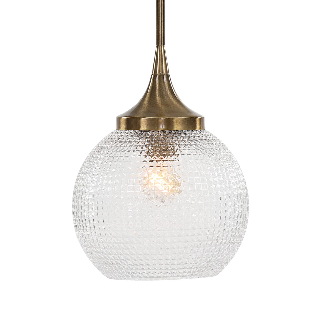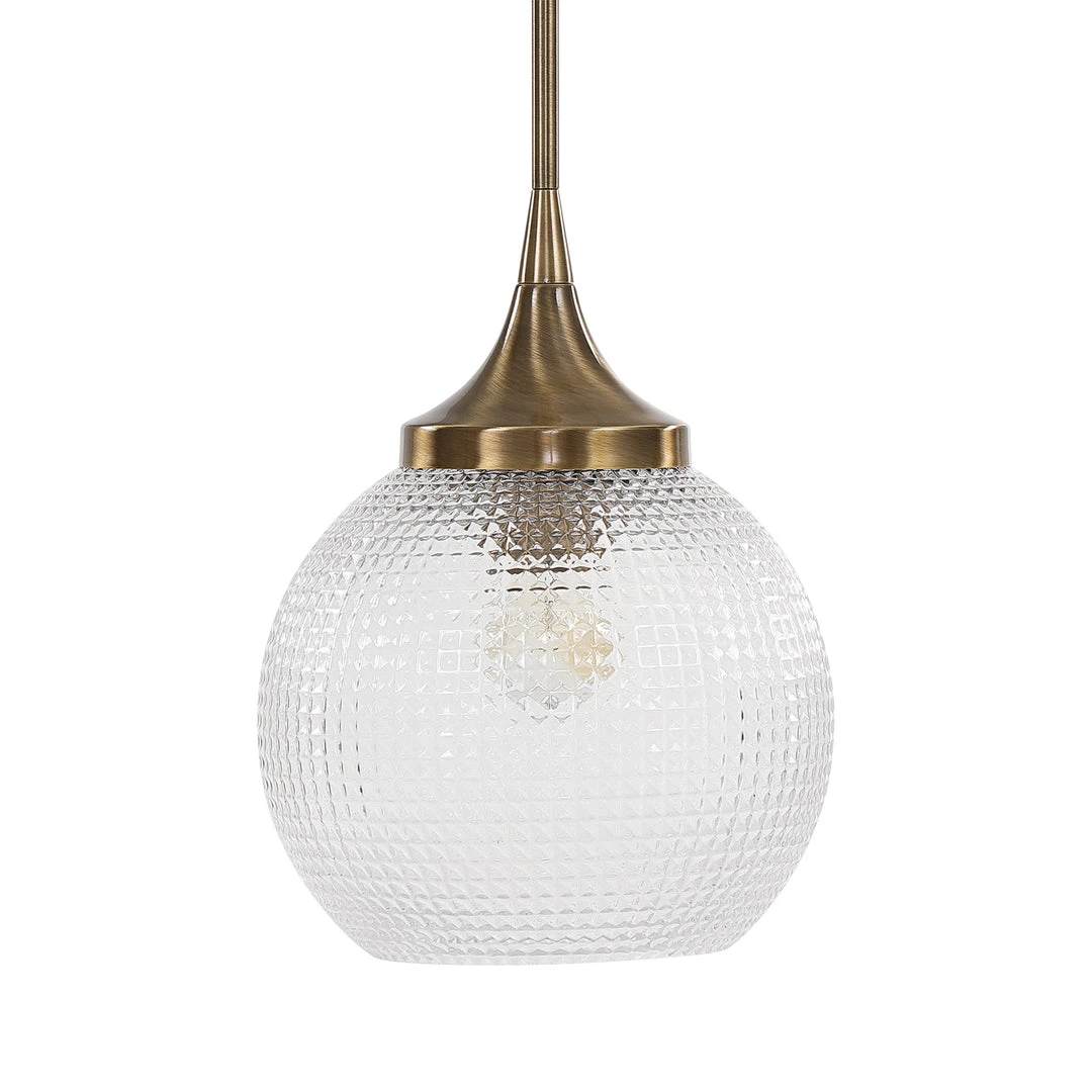 Welcoming Warm Aged Brass With Graceful, Curved Lines Holding A Clear Round Pressed Prismatic Pattern Glass In This Classic Timeless 1 Lt. Mini Pendant. With 1-100 Watt Max, Edison Socket And Includes 15 Wire, 3-12″ Stems And 1-6″ Stem For Adjustable Installation.