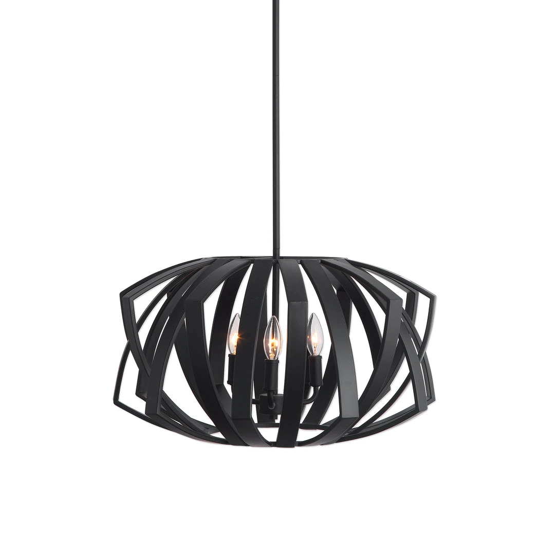Matte Black Geometric Pendant Harkens From Mid Century Design Roots. 3-60 Watt Max, Candelabra Sockets And 3-12″stems & 1-6″ Stem For Adjustable Installation.