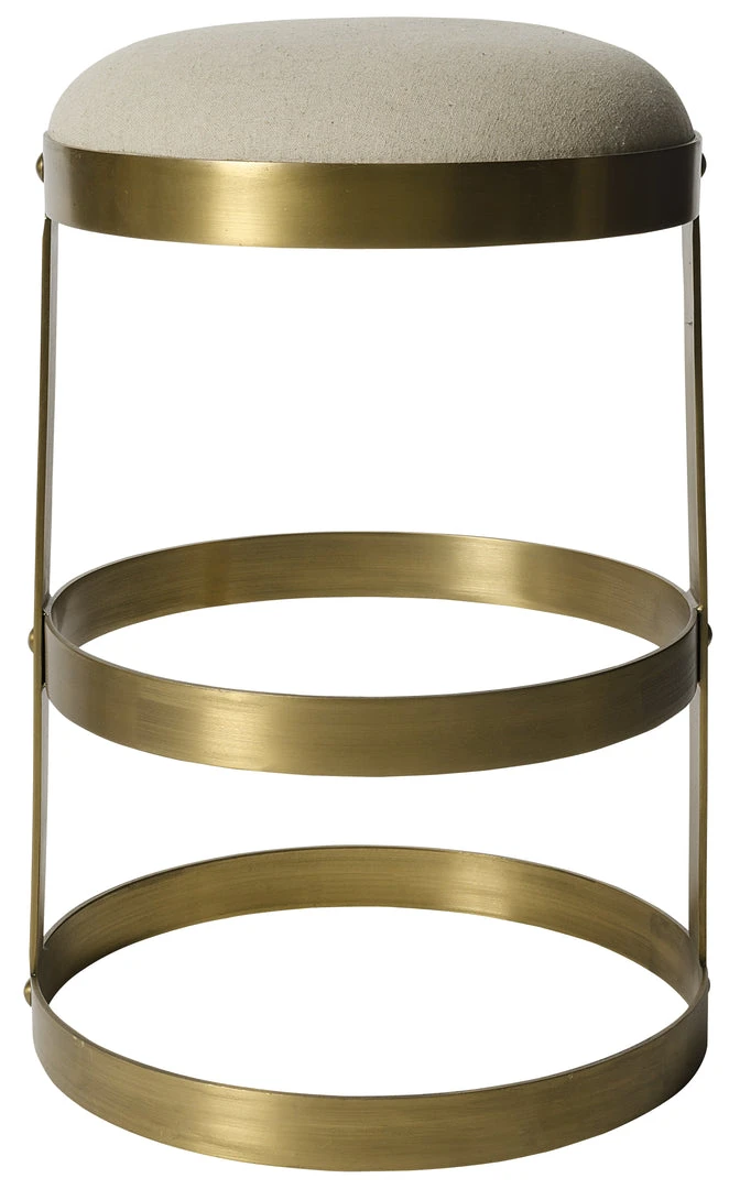 Three thick circular bands of metal form this stool’s base and footrest, and support its soft linen seat. It comes in your choice of a black or antique brass finish, and in both counter and bar heights.