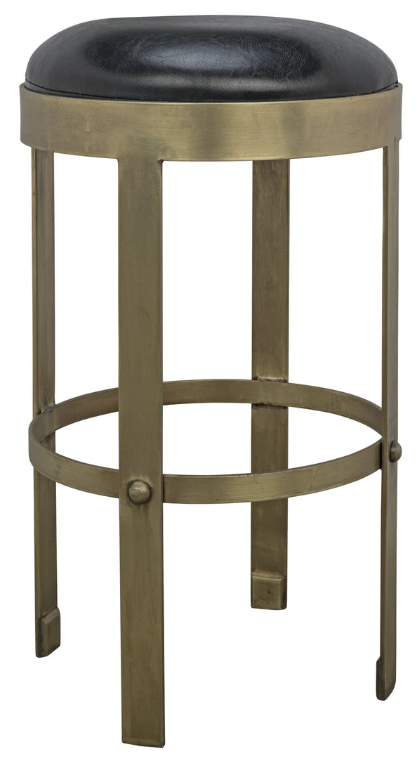 Thick circular bands of metal form this stool’s footrest and support its black leather seat. Royally finished in gold with steam-punk inspired rivet details on the leg, this is a chair suitable for any modern monarch.