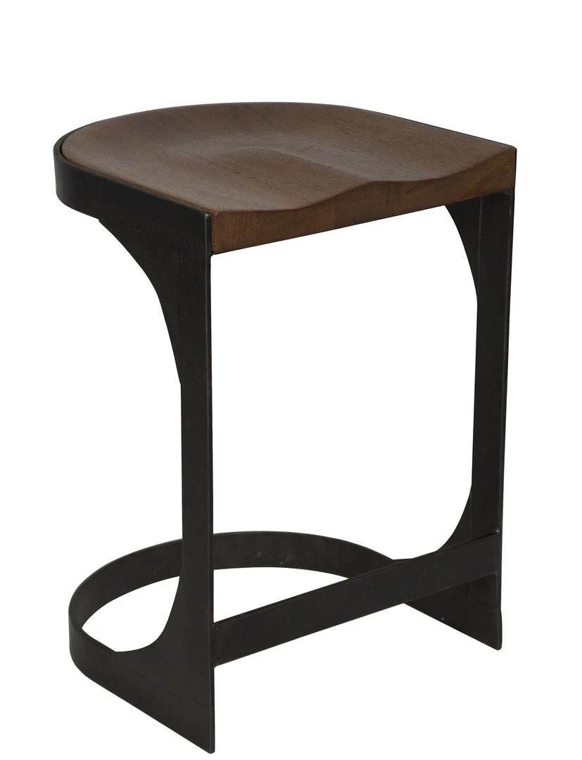 Cool, minimally treated metal adds intrigue to warm, highly polished walnut in the Baxter bar and counter stools from Noir. Completely handcrafted and finished, their seats are curved for comfort, and their bases are curved for style”