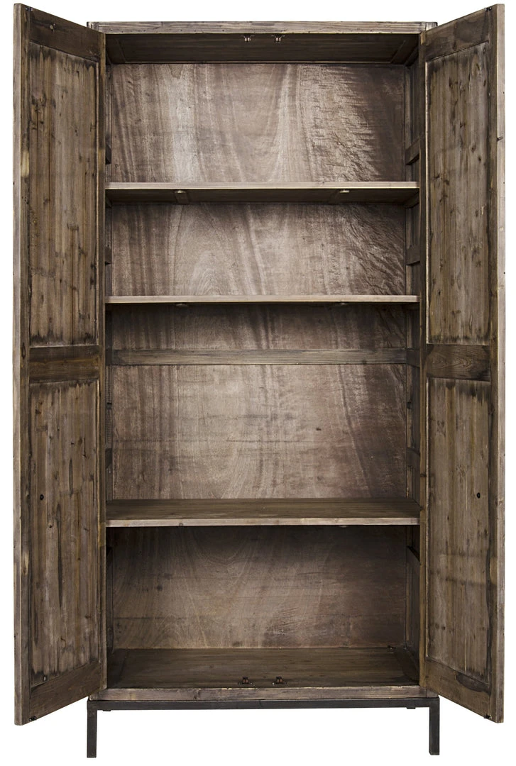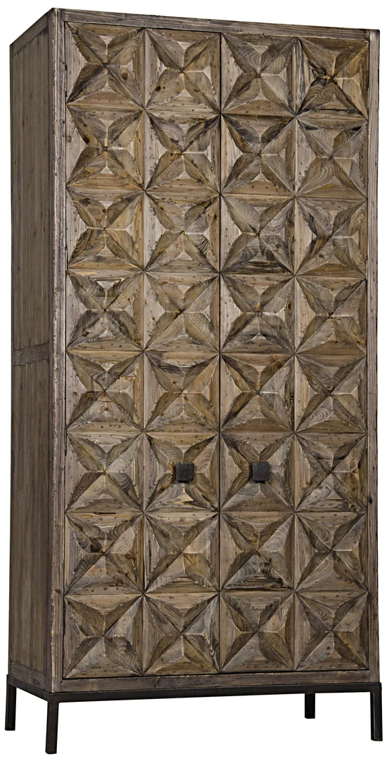 Dramatically sized at a full seven and a half feet tall, this intricately hand-carved reclaimed fir and metal hutch opens to reveal three adjustable shelves. To let the carvings shine, the rest of the design is kept simple, and the wood is finished minimally in a soft natural.