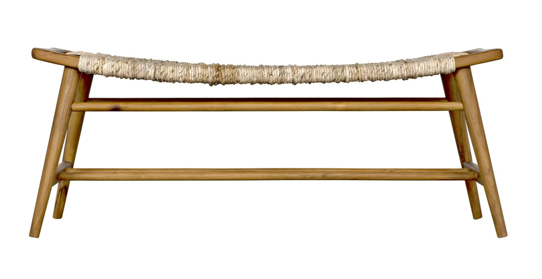 Casually sophisticated and design driven without pretension, the seat of the simple, clear coat satin finished teak bench is generously wrapped with rush seagrass. A natural product, the shading of the seagrass will vary, and no two benches will be identical.
