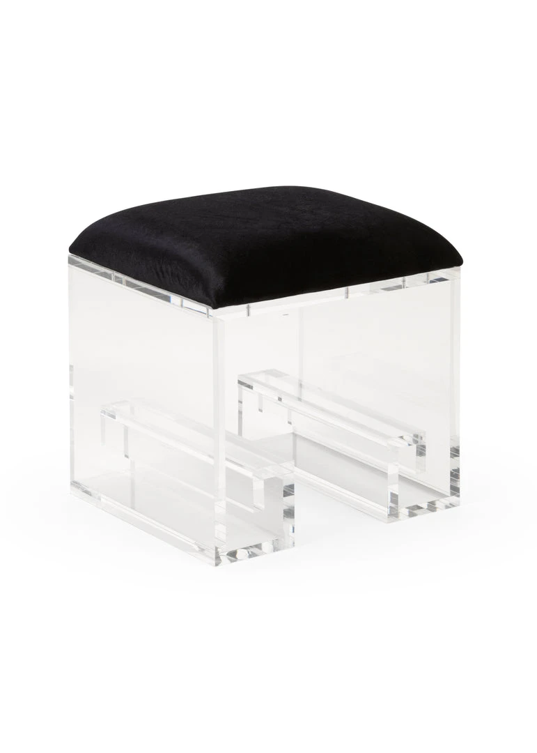 Our Alluring Mykonos Stool Features An Acrylic Base With Curvaceous Legs Created By The Greek Key Motif. Topped With A Black Velour Cushion, It Certainly Doesn’t Compromise Comfort. It Is The Perfect Choice Where Space Is Limited, So Get Ready In Style And Enjoy The Mykonos Stool At Your Vanity, In Your Walk-In Closet Or Your Bedroom.