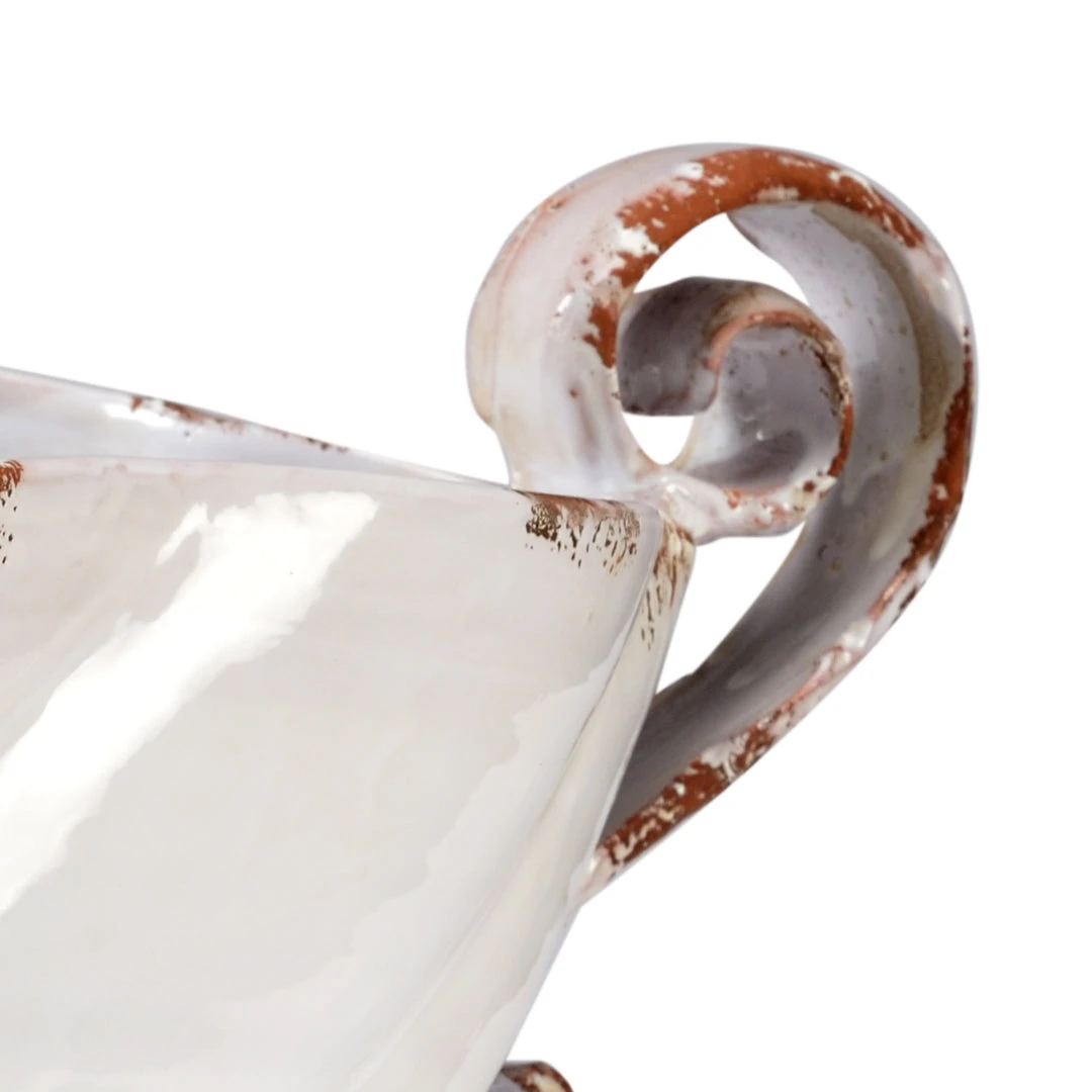 Tuscan Inspired Ceramic Bowl With Handles In An Antique White Distressed Finish.