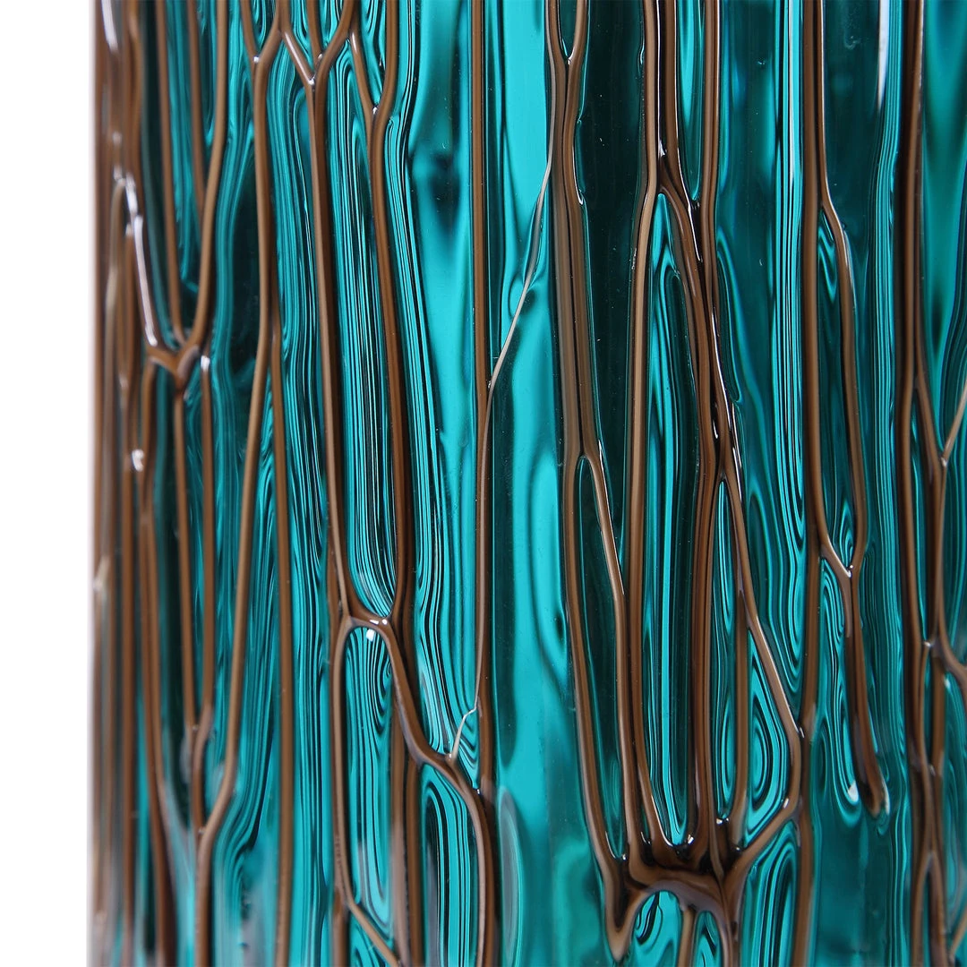 Set Of Two Candleholders Feature Teal Glass Base With Bronze Sugar Spun Accents And Brushed Nickel And Crystal Details. Includes Two, 4″x 3″ Distressed White Candles. Sizes: Sm-5x14x5, Lg-5x18x5