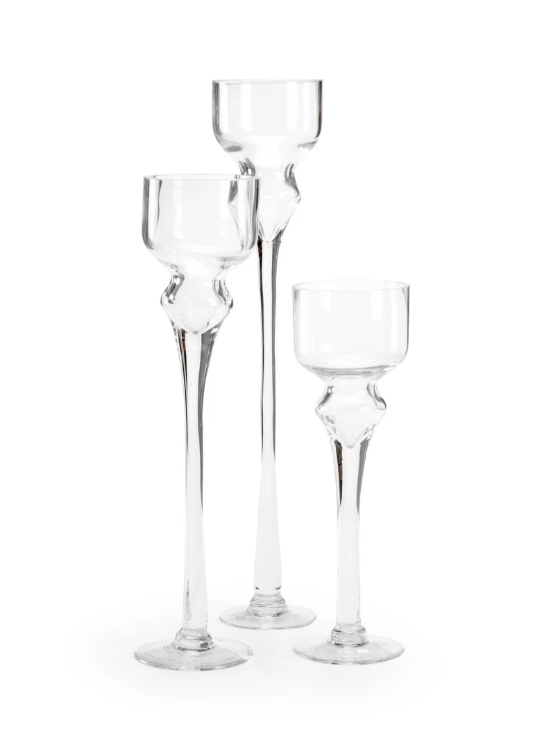 Set Of 3 Clear Glass Candle Stands. Small: 16″H X 5.75″W X 5.75″D, Medium: 20″H X 4.75″W X 4.75″D.