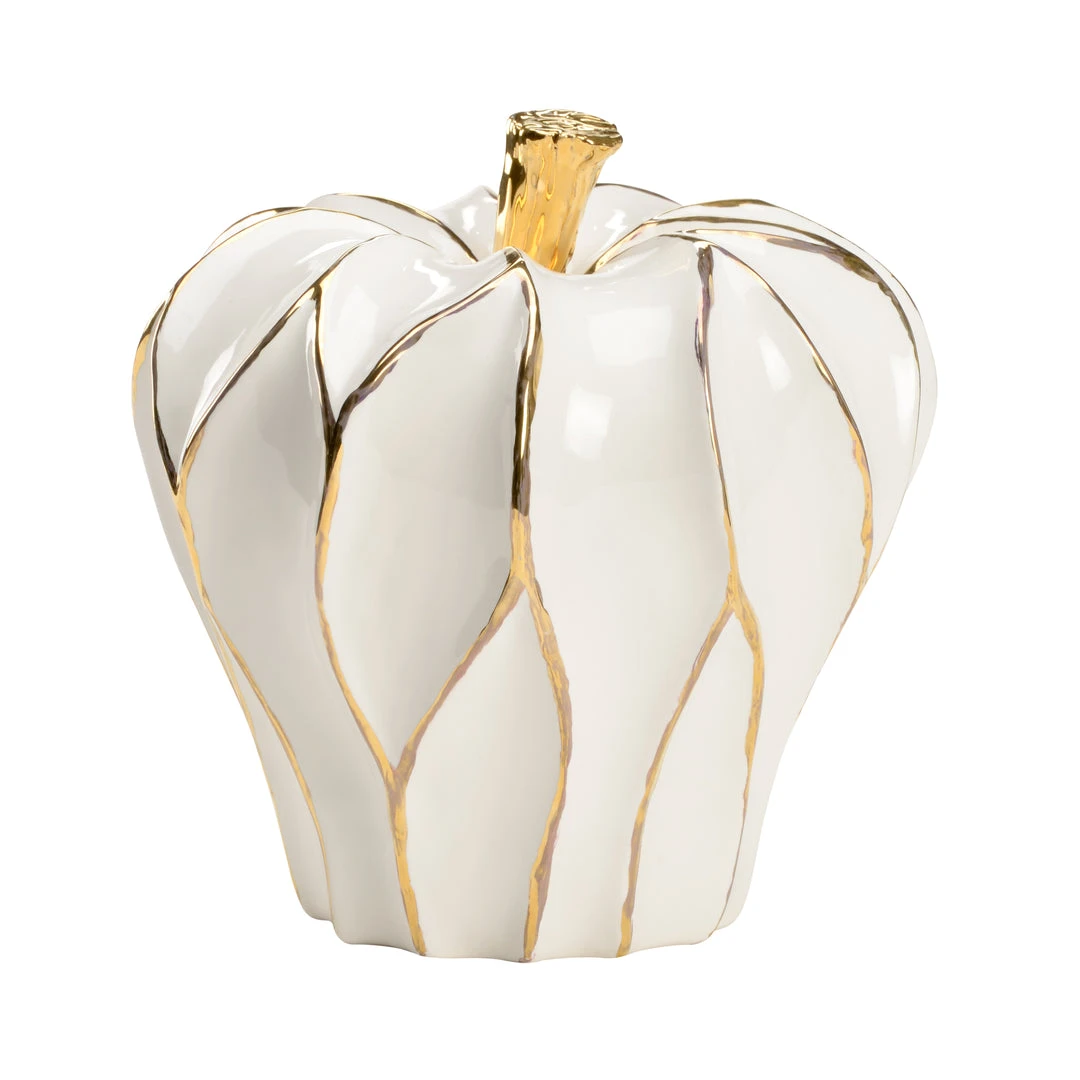 Faceted Ceramic Apple In White Glaze Finish With Metallic Gold Accents And Stem. Designed By Claire Bell.
