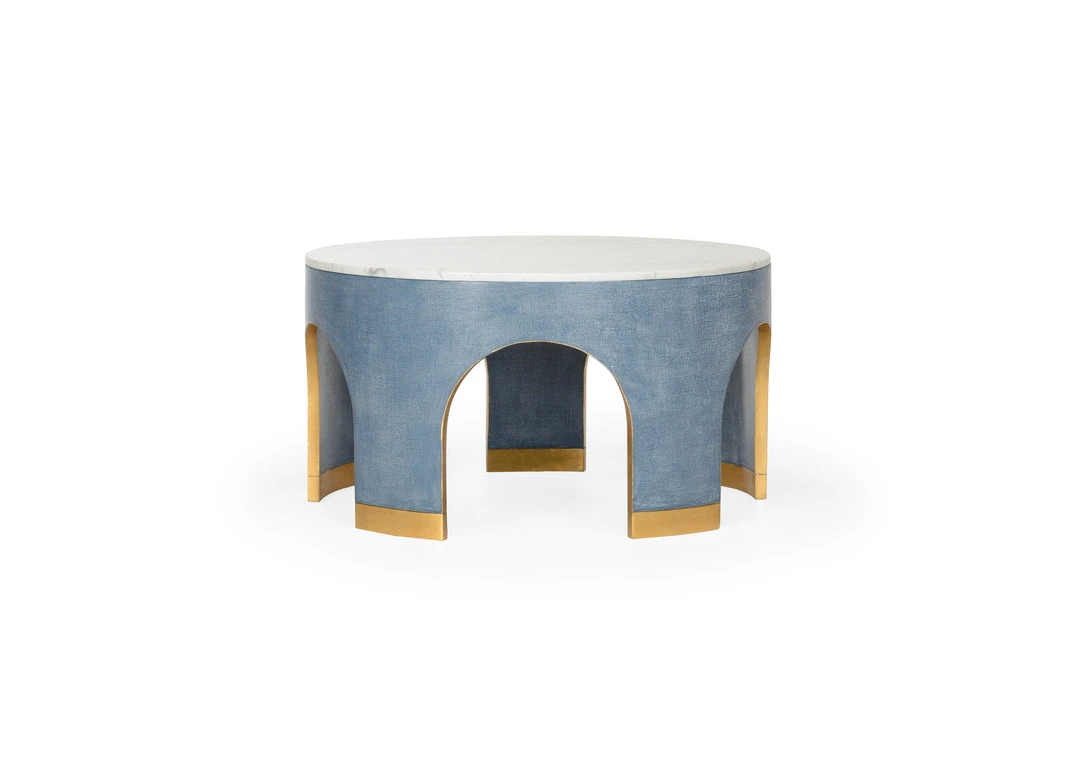 Beautiful, Unique And Functional, The Aqueduct Cocktail Table Sports Blue Grasscloth With Marble Top And Antique Gold Leafed Accents. Designed By Elizabeth Wicker.