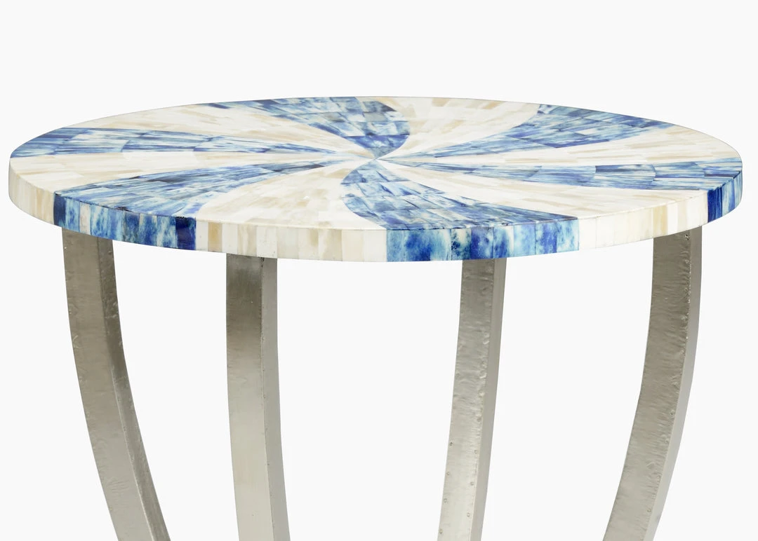 Blue And Cream Swirl Patterned Wooden Bone Inlay Top On Silver Plated Wood Base