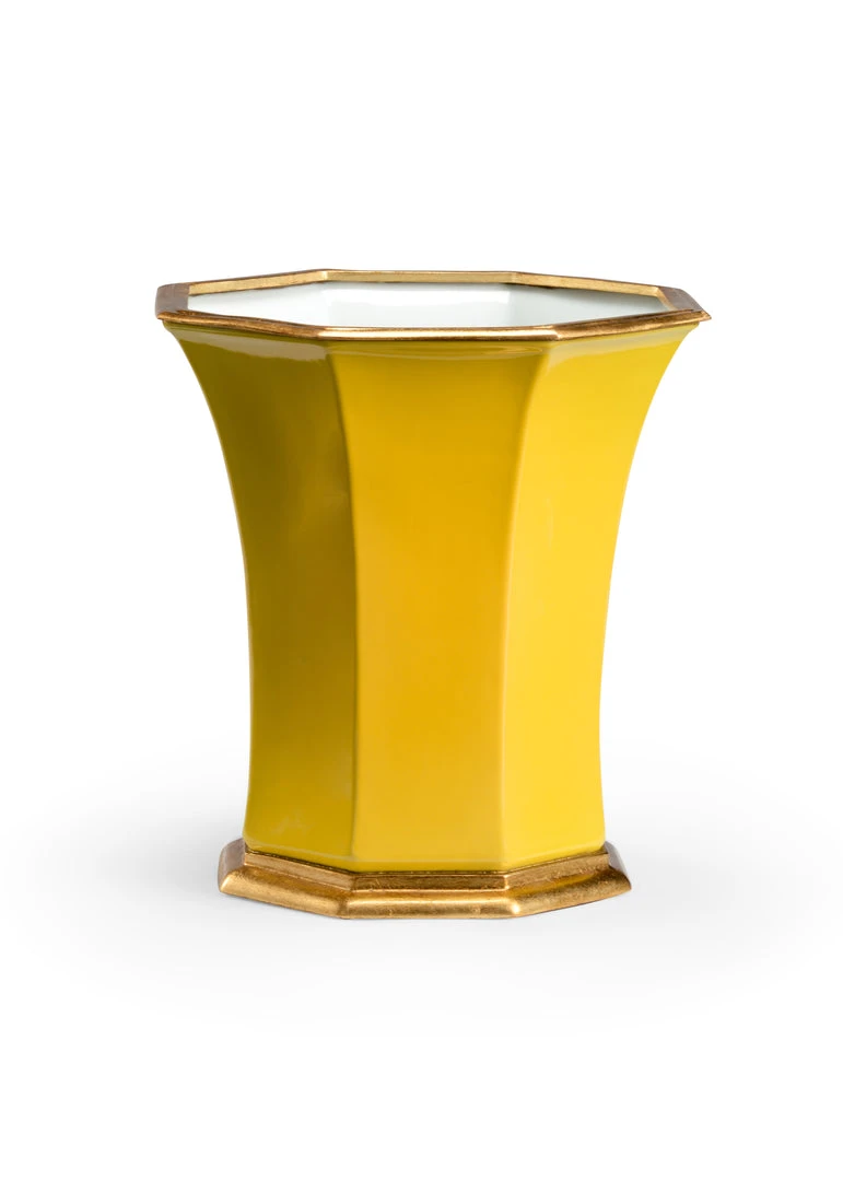 Mustard Yellow Glazed Ceramic With Antique Gold Leaf Brass Rim And Base