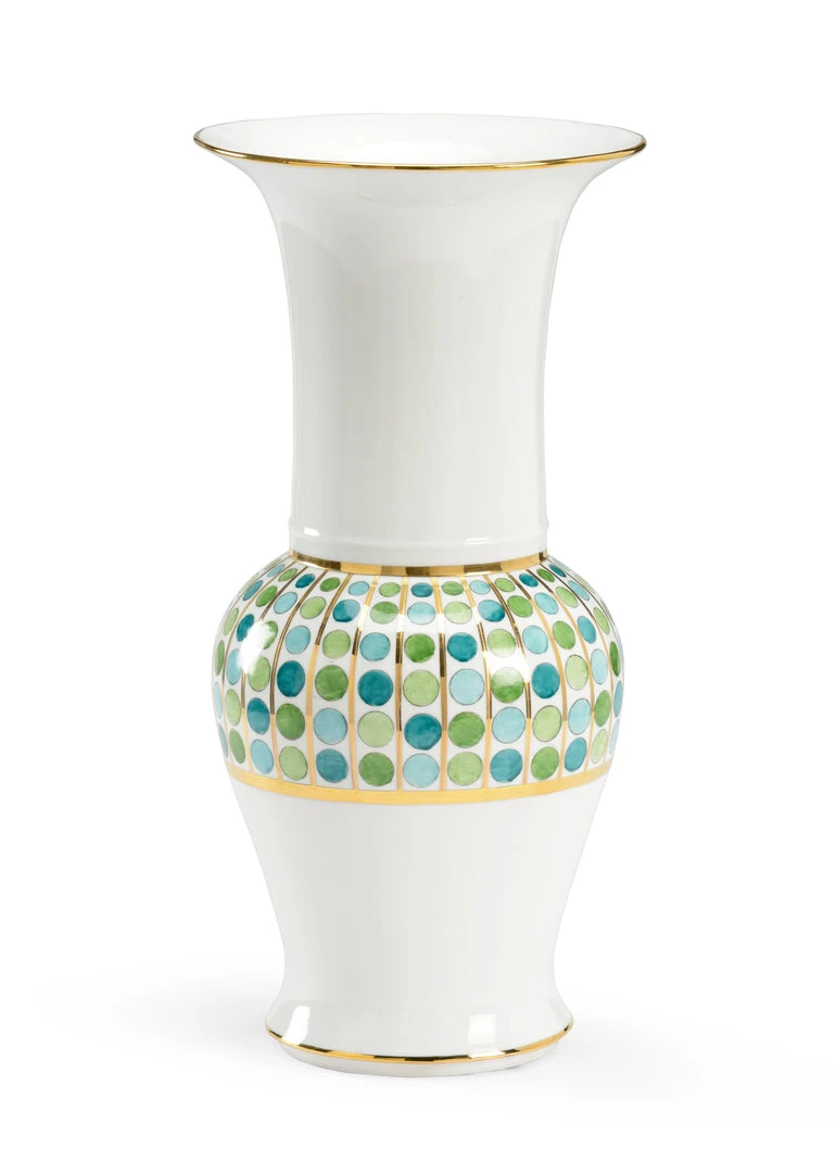 White Porcelain Vase With Shades Of Green Pattern With Metallic Gold Accents