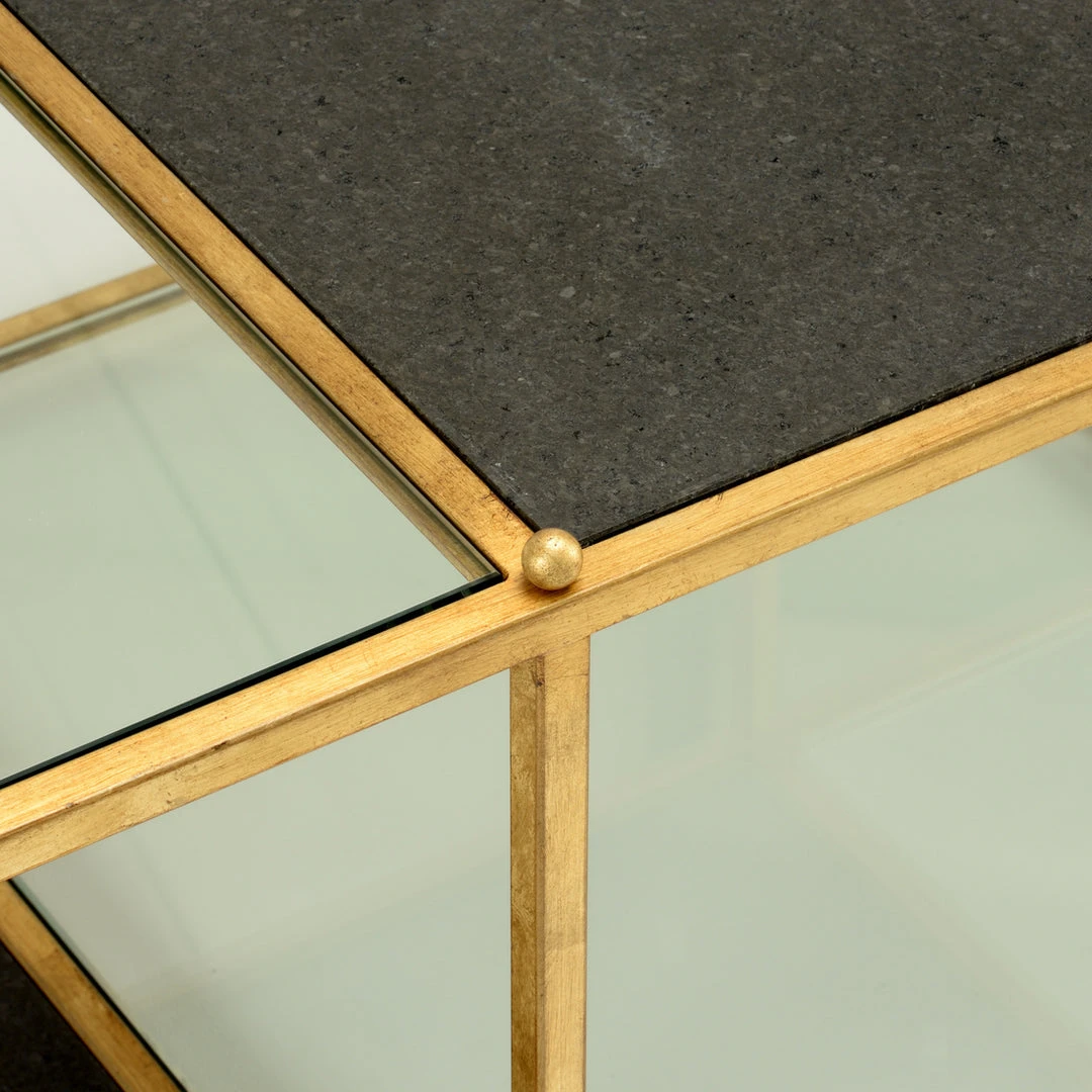Antique gold leaf iron cocktail table with natural black marble and clear glass.