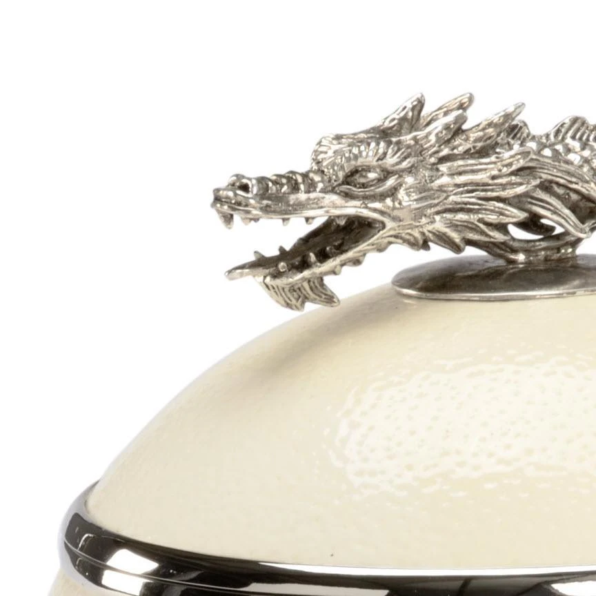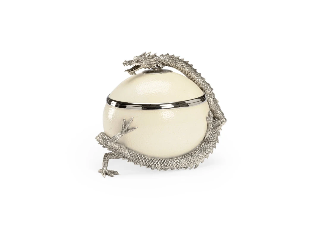 An Incredibly Detailed Silver Plated Lost Wax Cast Brass Dragon Delicately Wrapped Around A Beautiful Box Made Of A Real Ostrich Egg. Box Rims Trimmed In Nickel, A True Work Of Art Made With The Highest Of Craftsmanship.