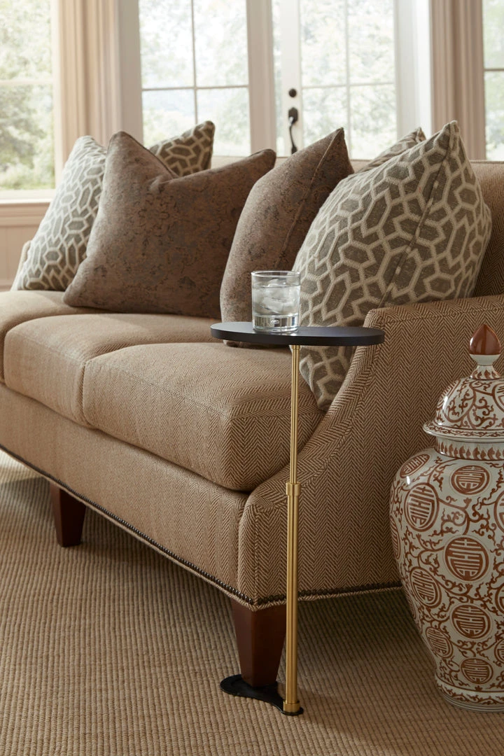 This Modern Drinks Table Will Add Character To Your Study, Den Or Library. It Features An Antique Brass Finished Column With Black Tabletop And Base. Its Unique Design Is Sure To Catch The Eye Of Your Guests.
