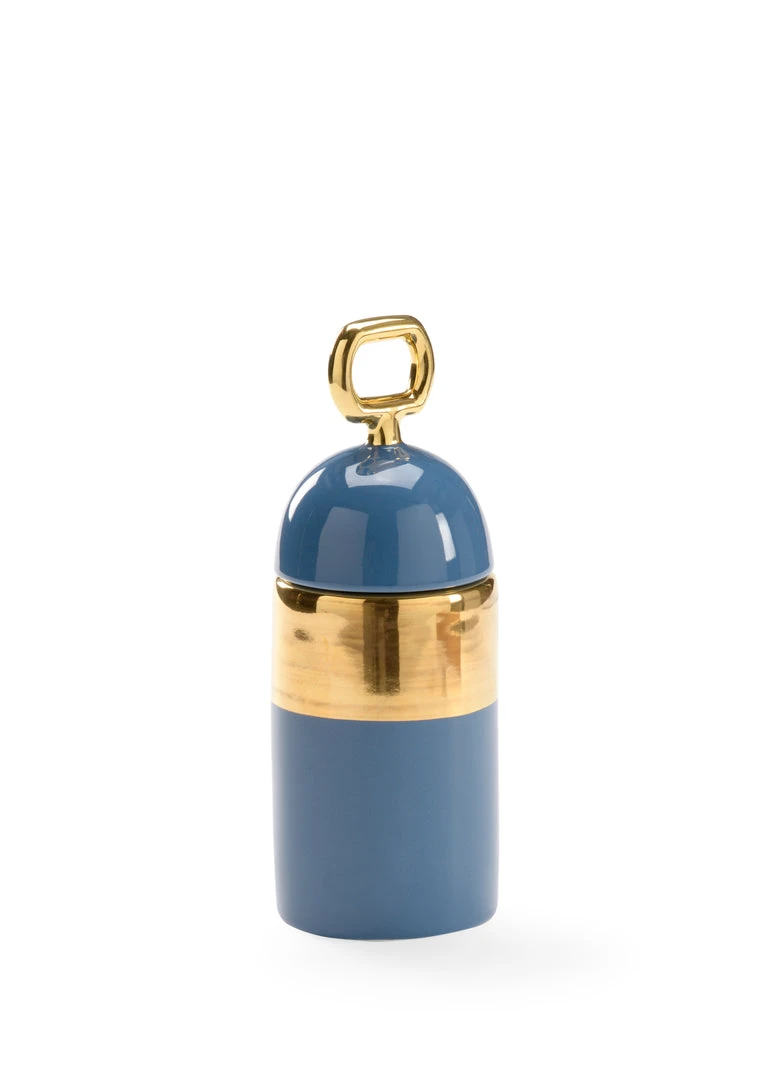 Banded Blue Covered Jar With Metallic Gold Accents. For Decorative Use Only. Designed By Claire Bell.