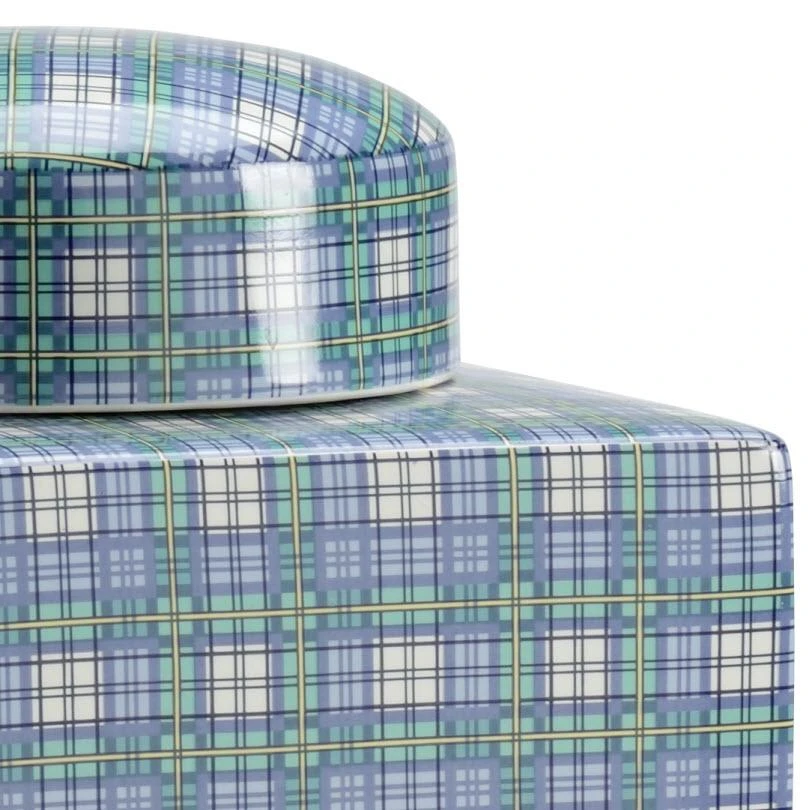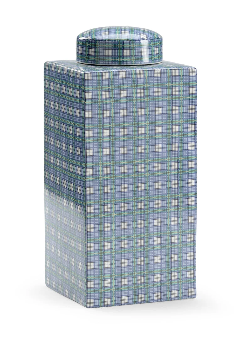 Blue,green & White Plaid With Yellow And Black Stripes Porcelain Jar With Lid
