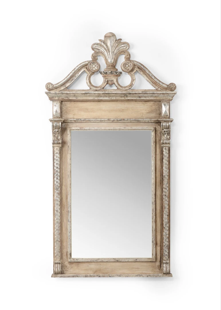 Classic And Beautiful Wood Frame In Old World Silver With A Prince Of Wales Pediment And Antique Mirror.