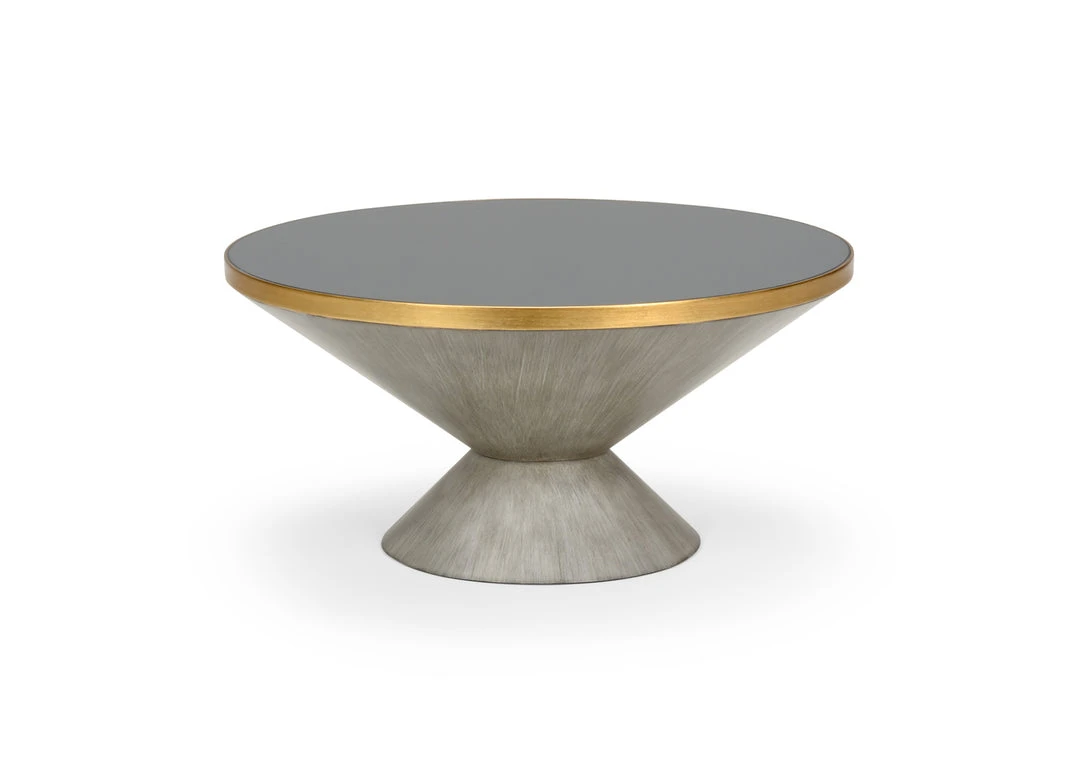 Antique gray wash finished wood with dark gray glass top and antique gold edging.