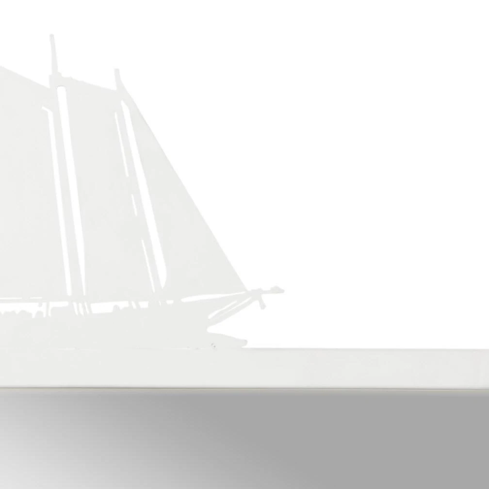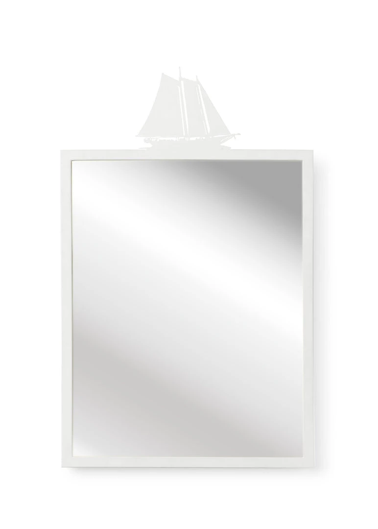 White Lacquered Metal Mirror With A Sailing Ship Top.