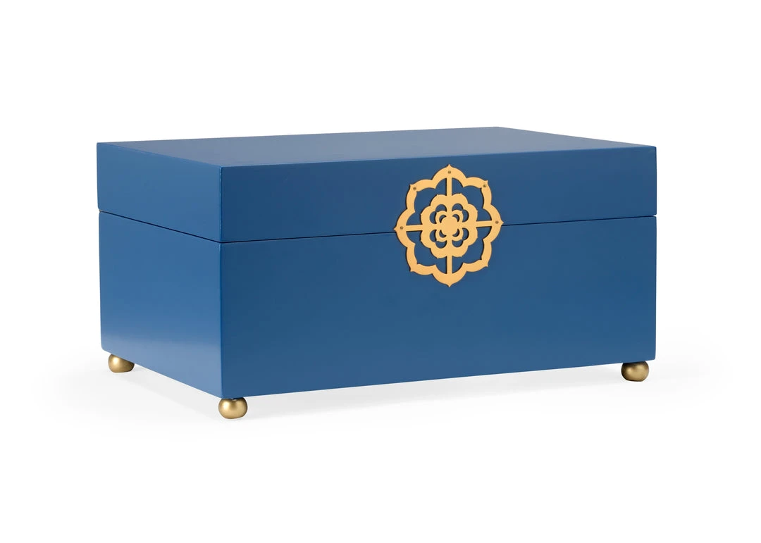 Unlined Wooden Box Painted Georgian Blue With Decorative Feet And Beautiful Medallion Hardware. Designed By Shayla Copas.