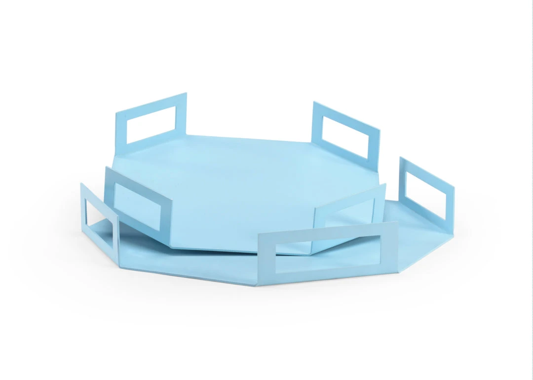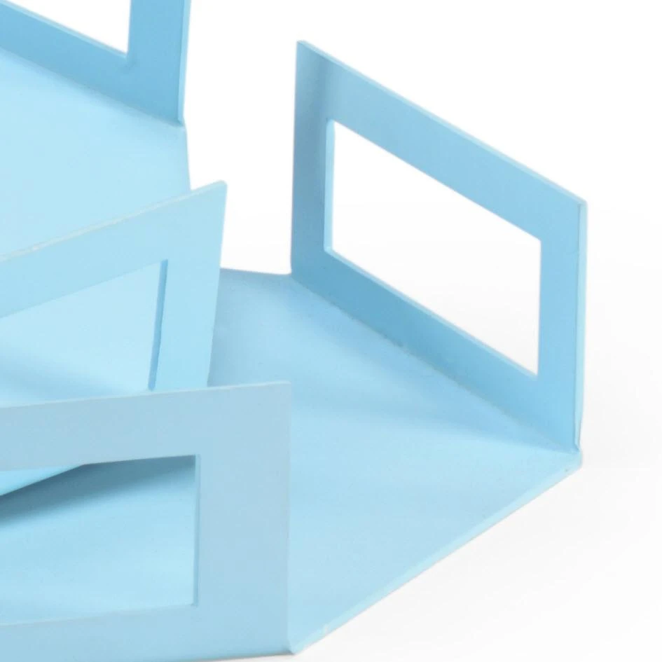 Set Of Two Handled Iron Trays In Light Blue Lacquer. Small Tray 3h X 17w X 17d