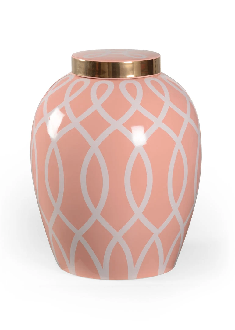 A Midsize Ginger Jar Featuring An Elongated Graceful Geometric Design In Metallic Satin Gold With A Coordinating Lid Detail. Available In A Variety Of Colors. Designed By Shayla Copas.