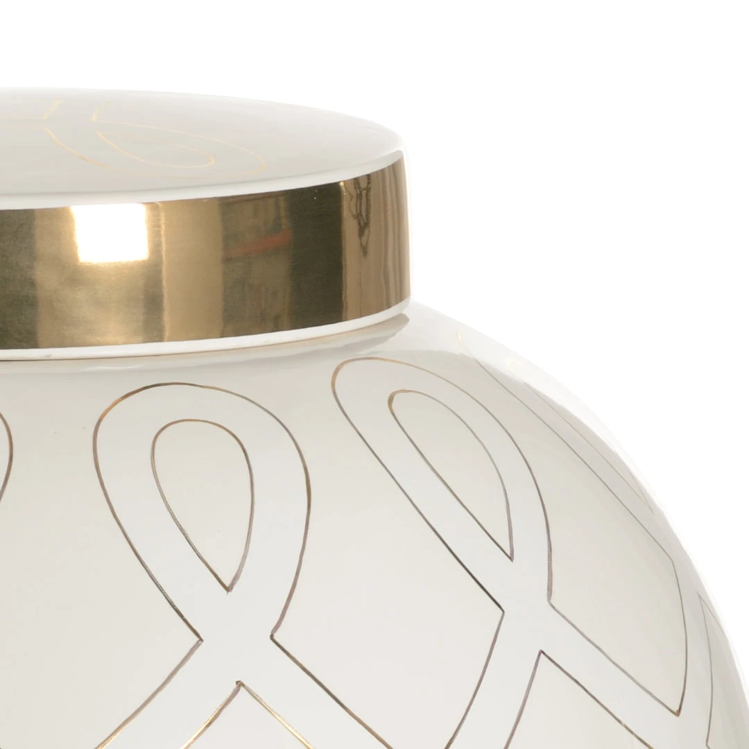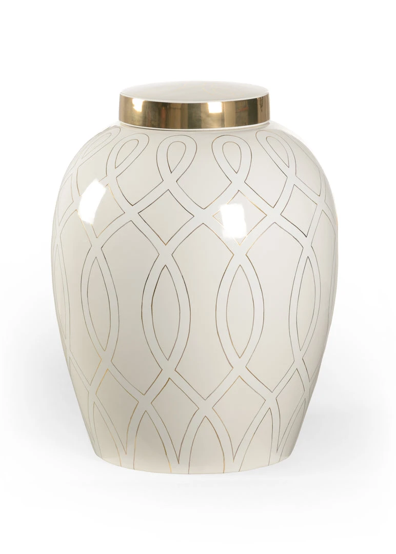 A Midsize Ginger Jar Featuring An Elongated Graceful Geometric Design In Metallic Satin Gold With A Coordinating Lid Detail. Available In A Variety Of Colors. Designed By Shayla Copas.
