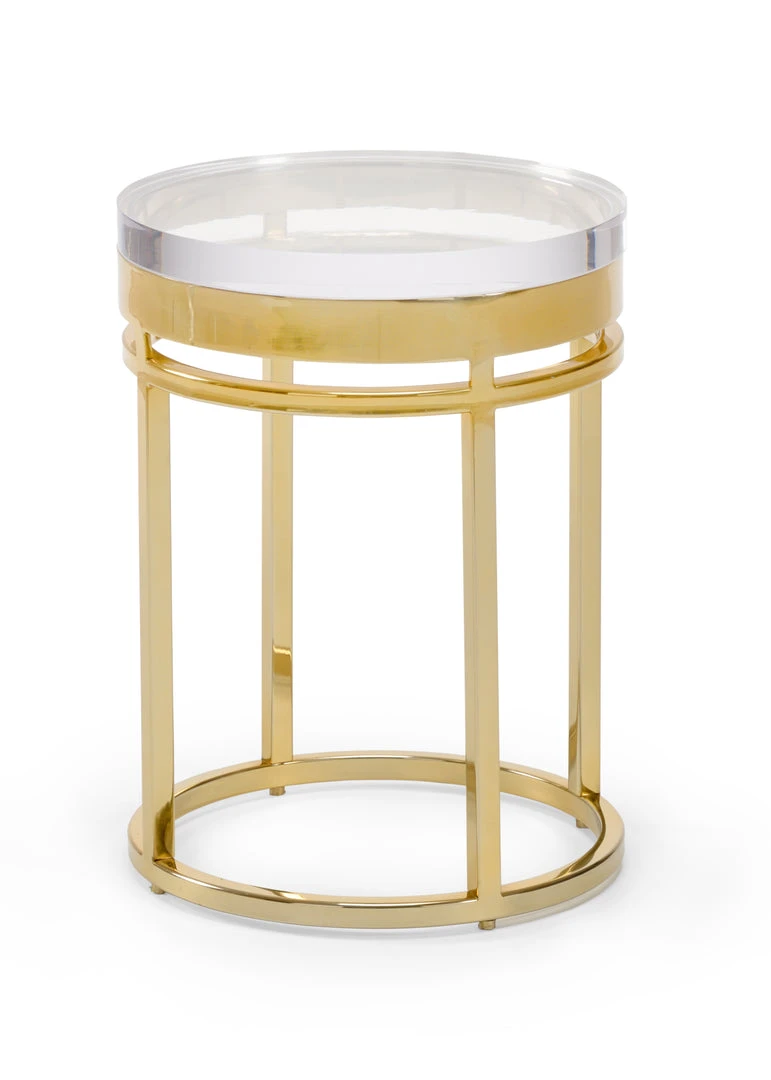 Sharp And Decorative Small Drinks Table With Large Acrylic Top And Polished Brass Finished Metal Base.