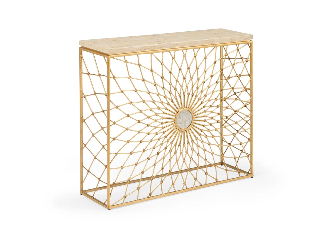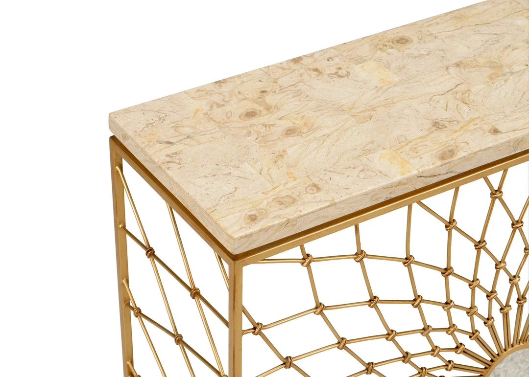 Starburst Metal Console With A Stone Top And An Antique Mirror Disk.