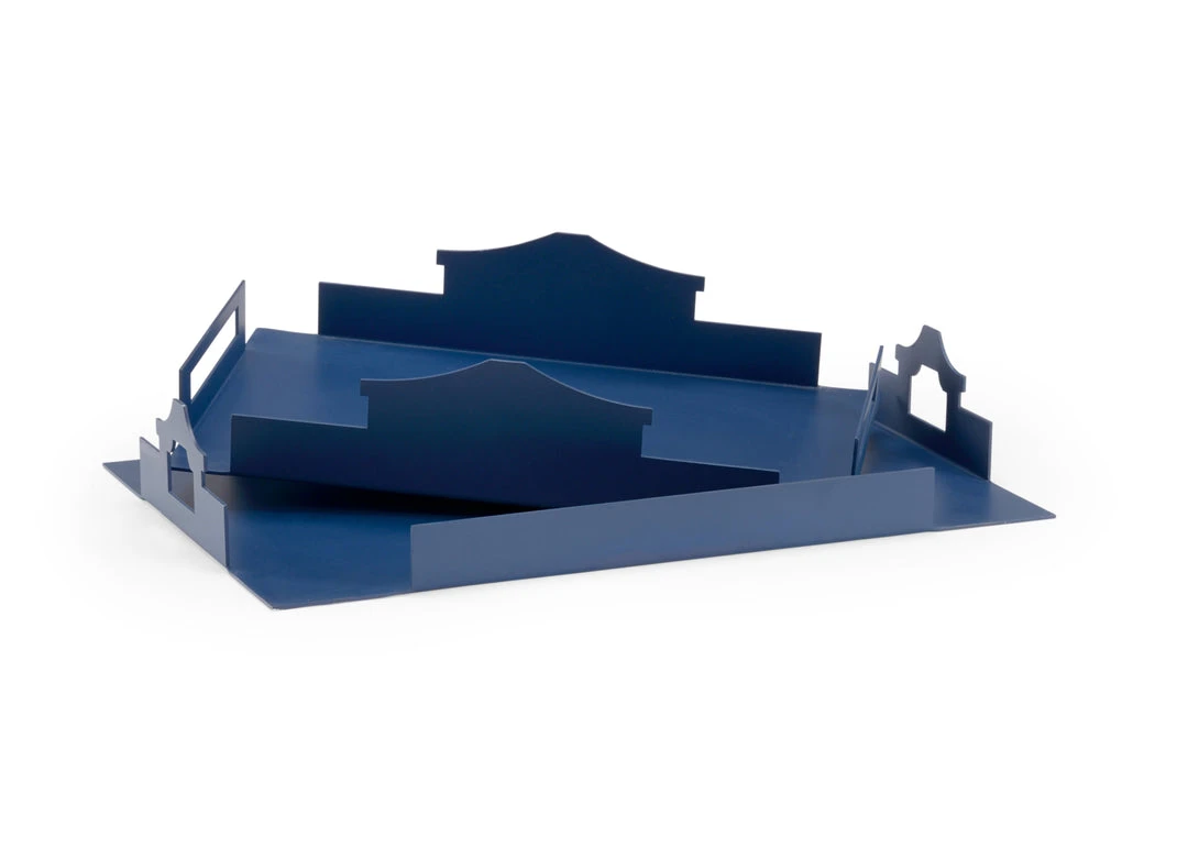 Set Of Two Pagoda Inspired Handled Iron Trays In Navy Lacquer. Small Tray-4.5h X 20w X 12.25d