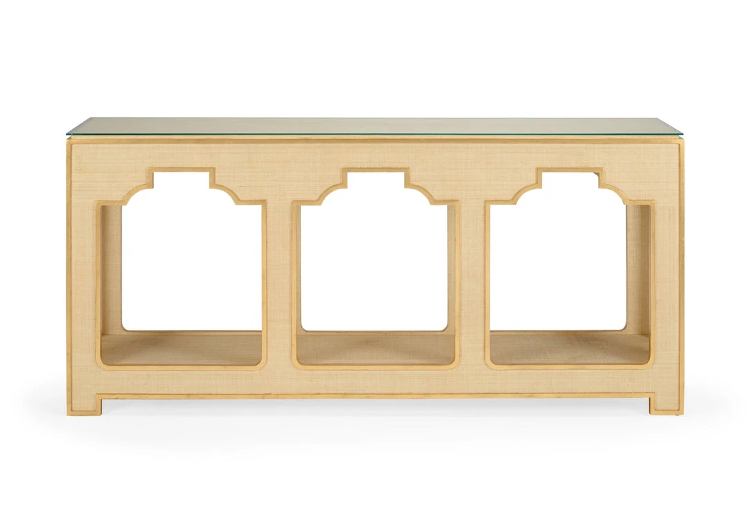 Cream Colored Raffia Console With Gold Accents And A Tempered Glass Top.