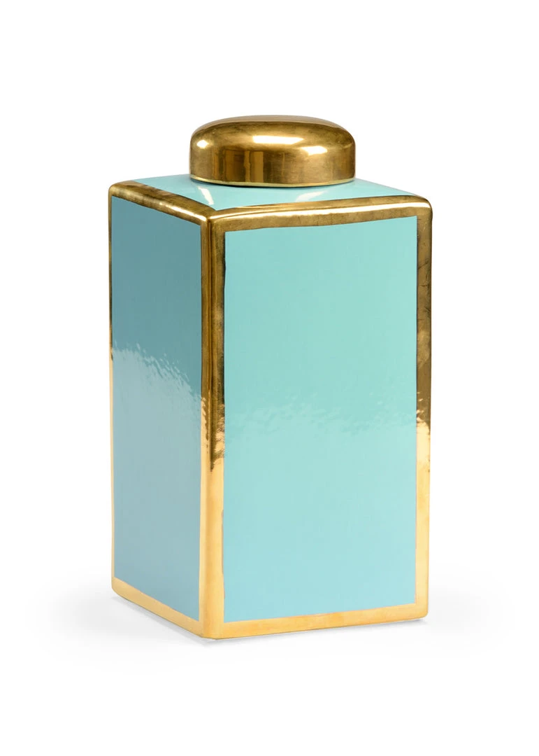 Light turquoise glazed ceramic with metallic gold detail and lid.