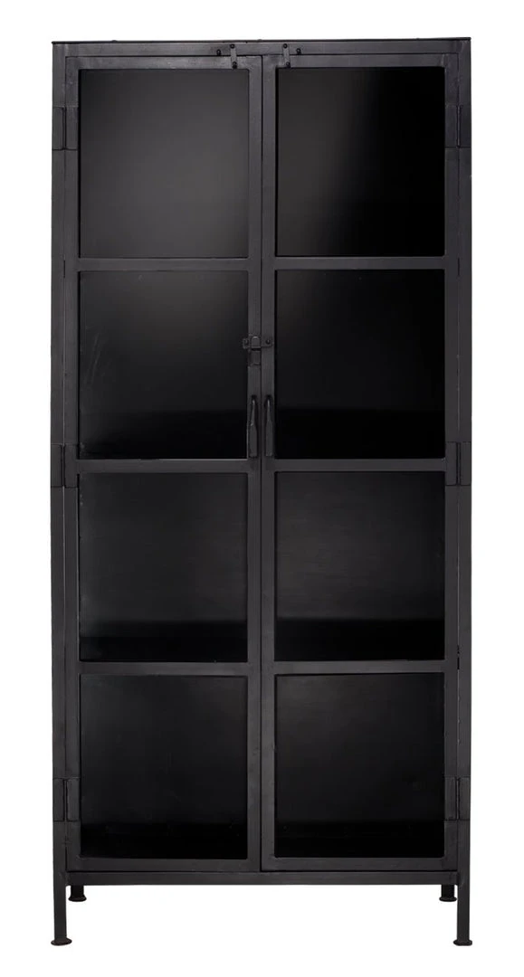 Glass panes are encased in simple black metal to create a minimalistic cabinet perfect for storage or display.
