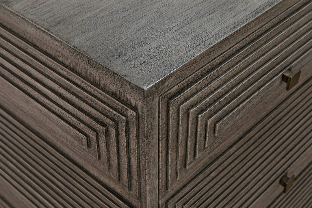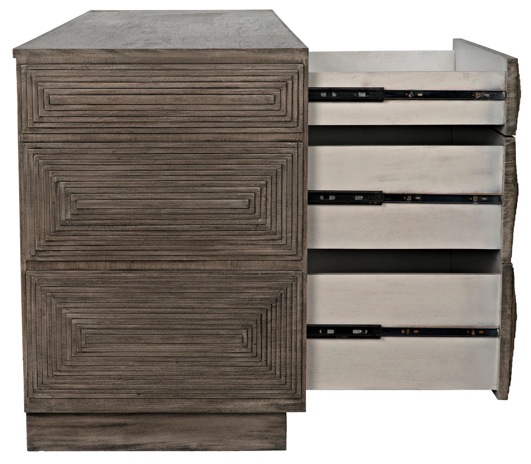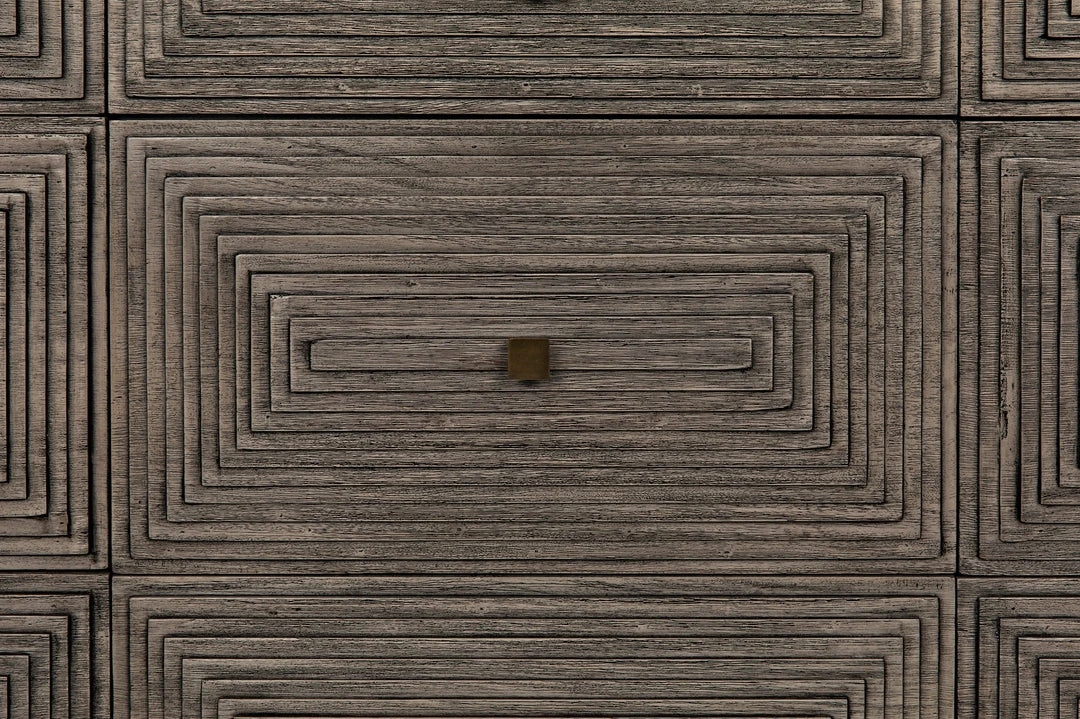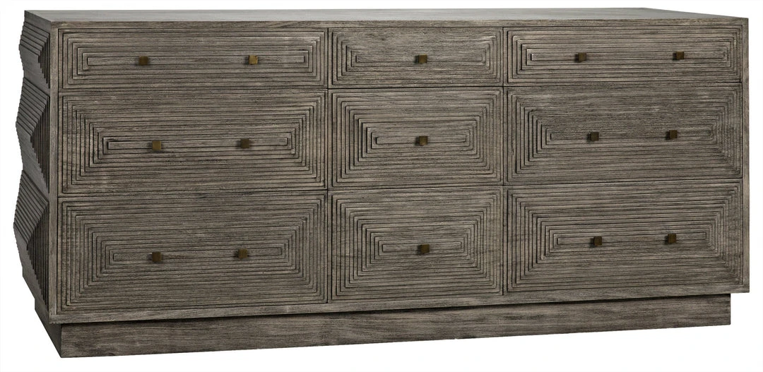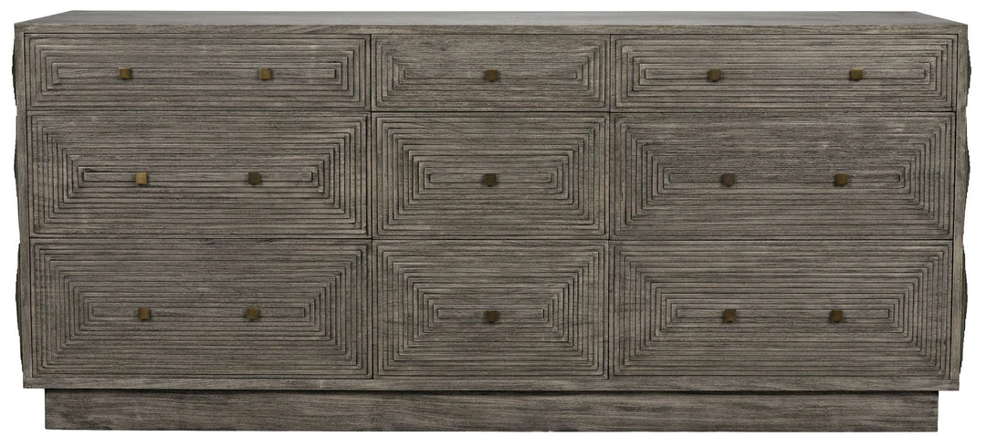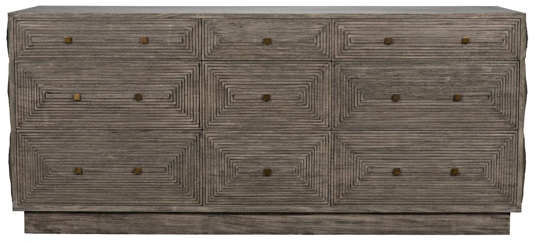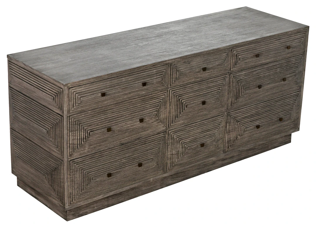 Intricately etched with dimensional linear patterns, this handsome dresser has nine drawers for plentiful storage. Handcrafted of mahogany, with a distressed gray finish, its design is a step down the path from traditional to contemporary.